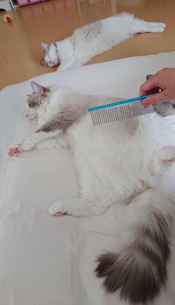「久しぶりに乳母のマッサージとブラッシングは極楽ニャ〜」