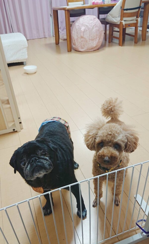 シッターがキッチンに行った時は喧嘩しないで2匹仲良く並びます(*´艸`*)何を期待してるのかな??(笑)