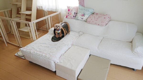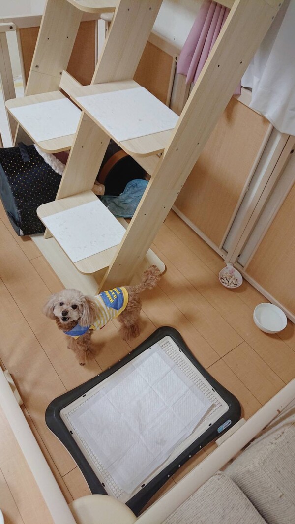 最初は平和ではない犬部屋だったので、サークルに避難💦