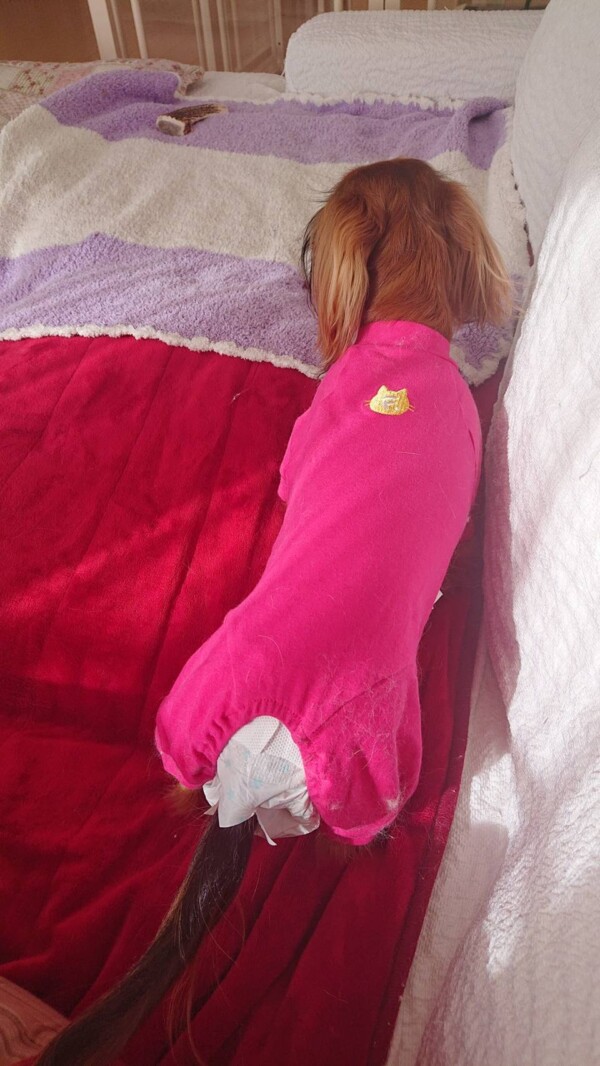 しかし、モカちゃん足も短いので、ストレッチが逆の効果で、またヌルリスルリと脱ぐので(*´ω`*)そしてカーペットにおしっこやられた( ;∀;)エーン
