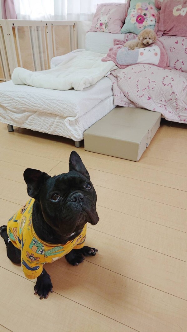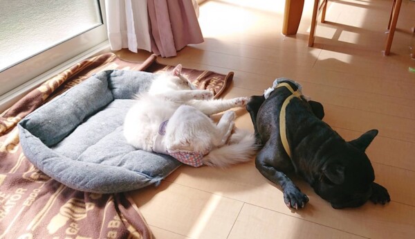 不安感のあるお泊りワンコ達はシッターに後追い強めだったりしますが、そのうち皆だんだん慣れて来て、後追いが軽くなりマイペースにソファーで寝ていたりするのですが…