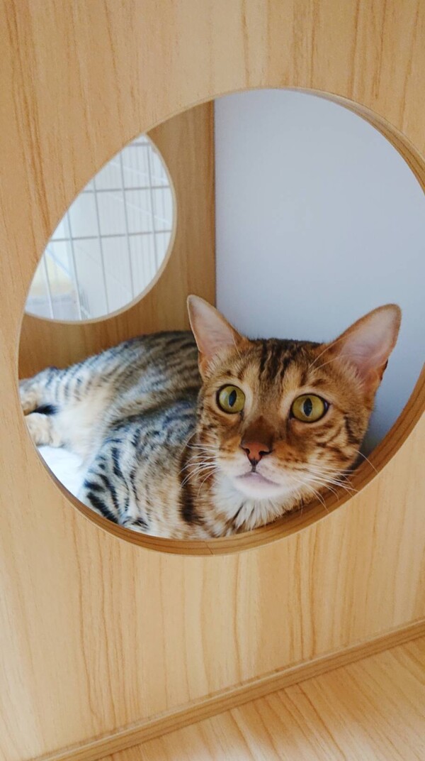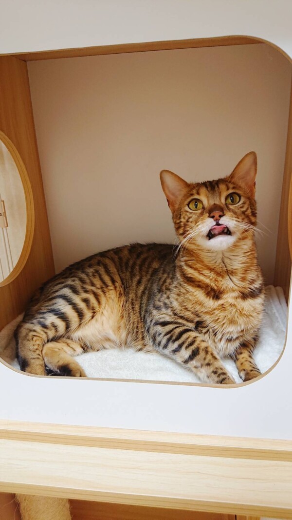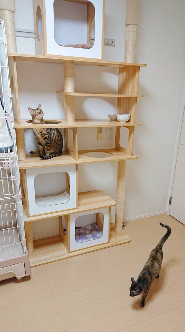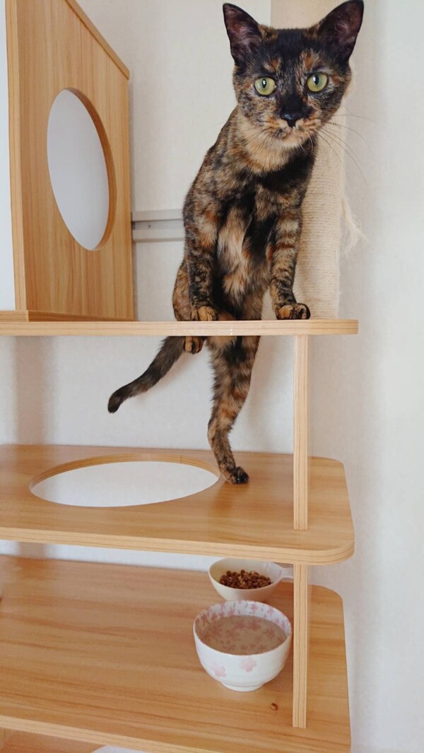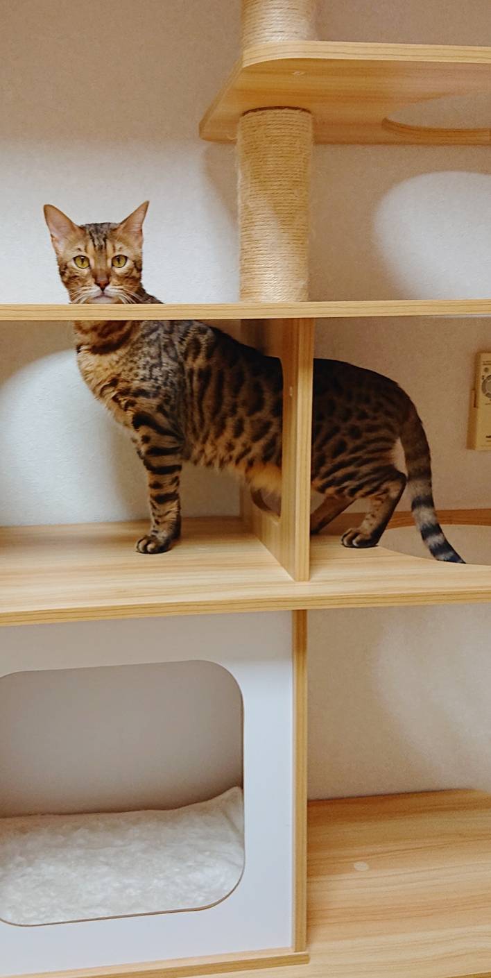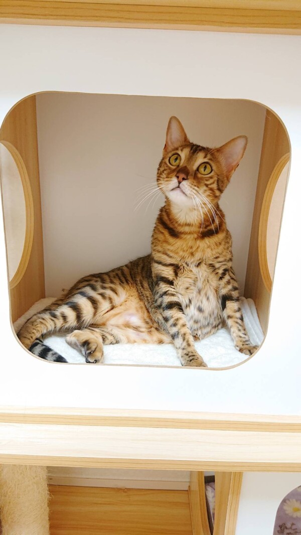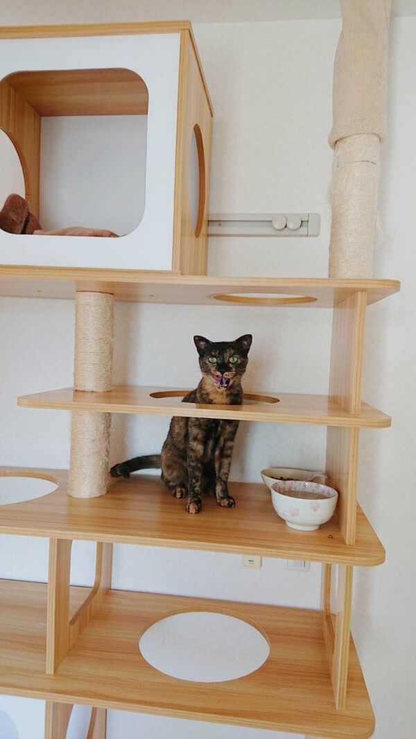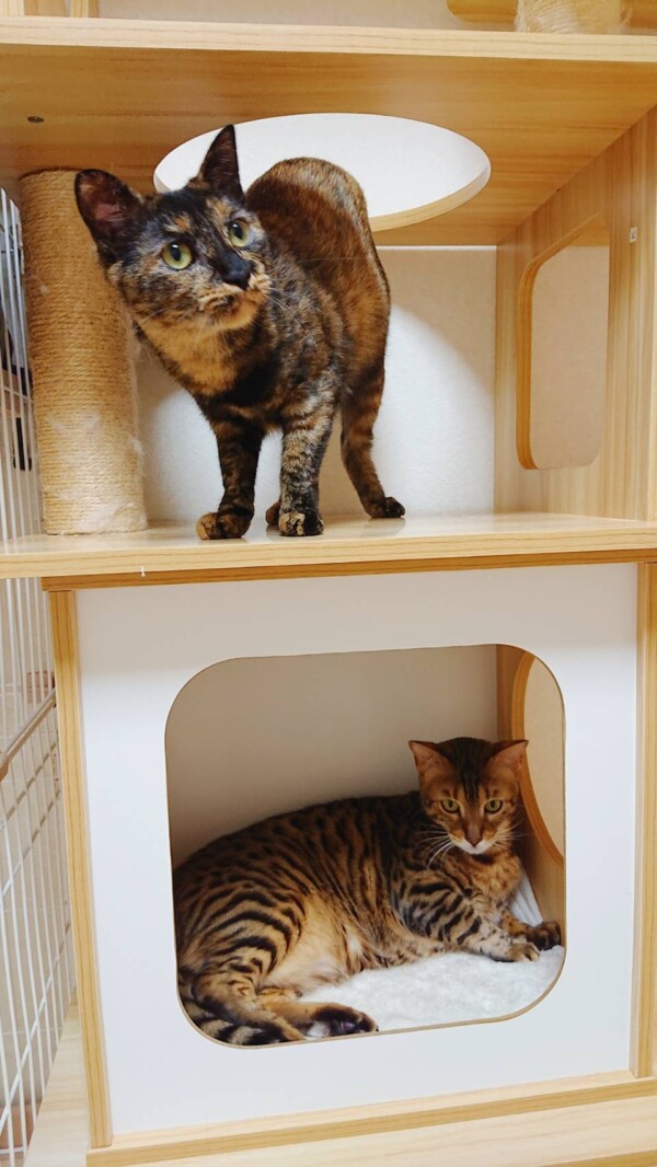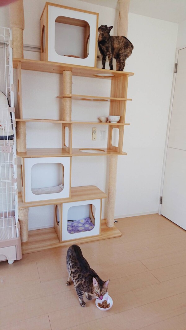 相変わらず入室したばかりの時はタワーに引きこもりがちですが、お泊りの回数を重ねるにつれて、ご飯を食べるまでが早くなり(*´艸`*)