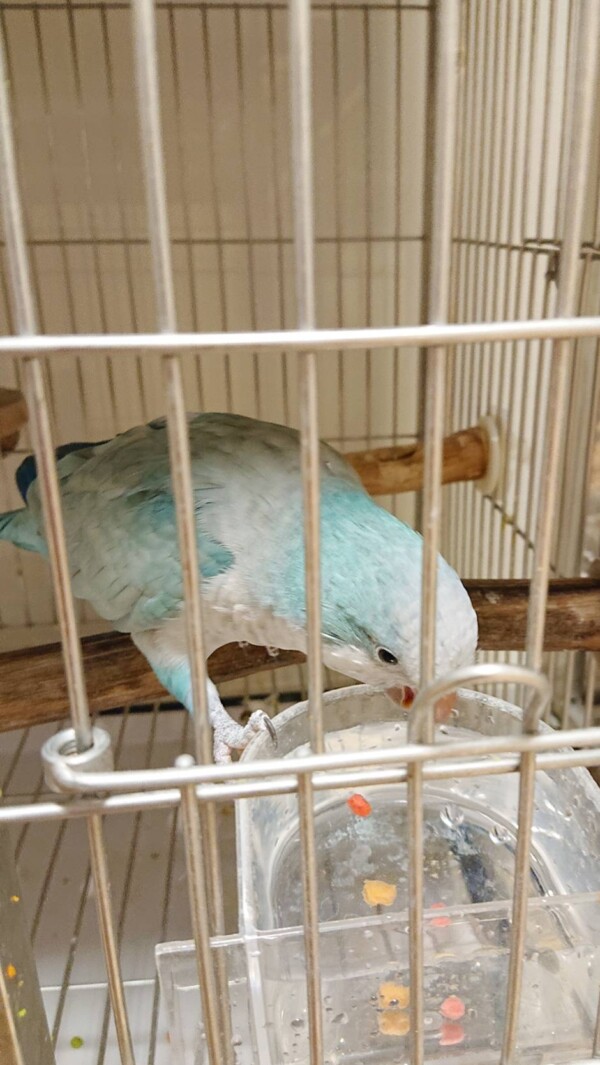 綺麗な羽の色のこちらは、わざわざご飯を水飲み場に持って来て食べるので1番お水が汚れる子(笑)