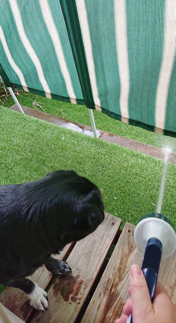庭掃除するシッターに水をかけられないように反復横とびで器用にかわし(笑)