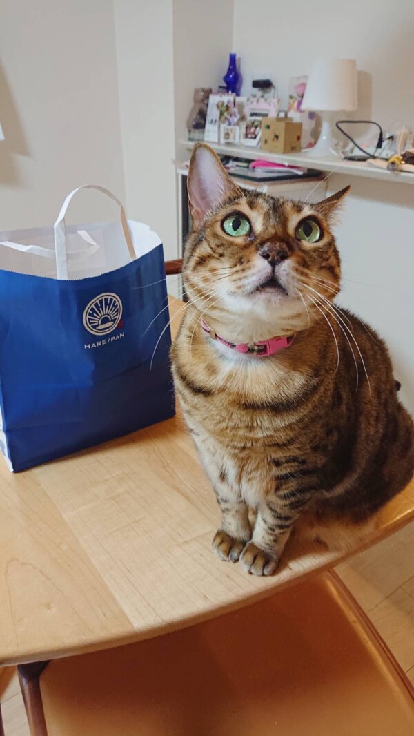 「シッターさんまたママさんから貰ってるニャ。シッターさん大好きなハレパンだニャ。炭水化物抜きダイエットはどうしたんだニャ??」