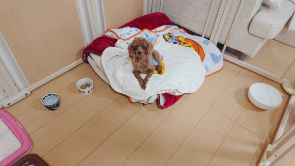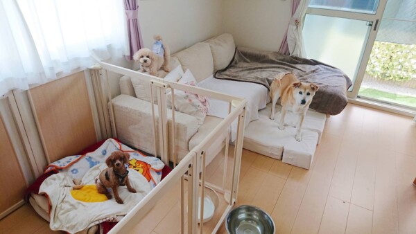 サークルの前を歩いただけで吠え立てられるので、ソファー上から降りられないマメ君と、寝不足ですっかり食欲減退してしまった日和ちゃん(´;ω;`)