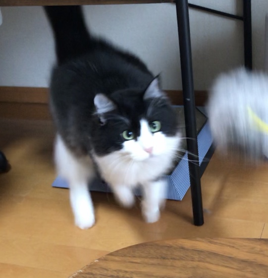 カーペットと同化しているぽんぽんおもちゃもバッチリ狙ってます😼
