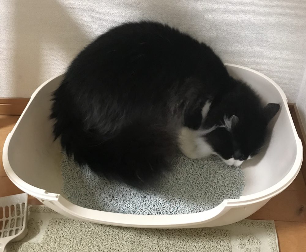 トイレ掃除をして、新しい猫砂をひくとリン君がイン😆