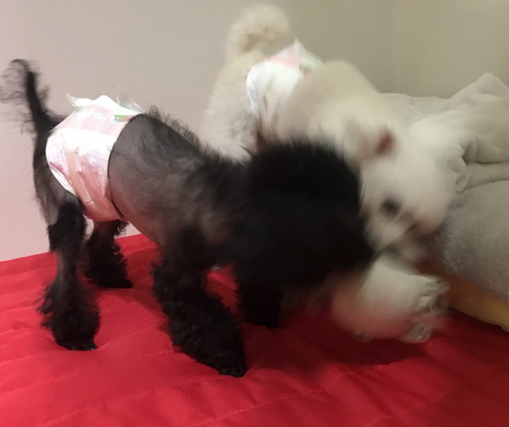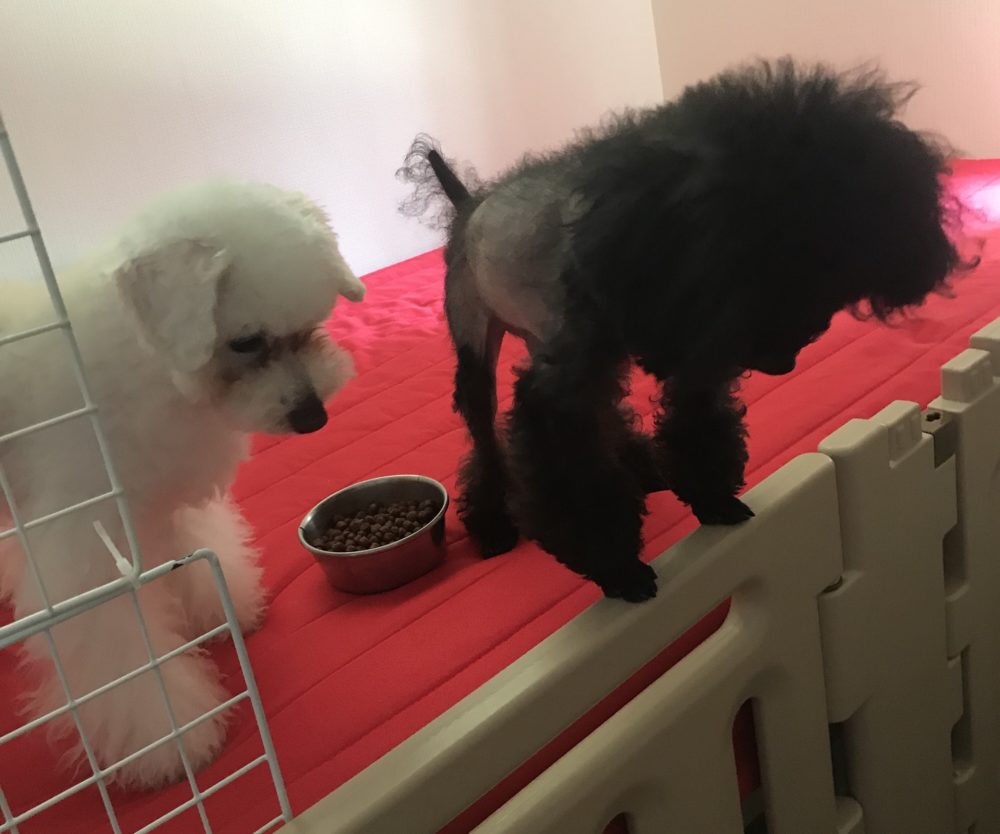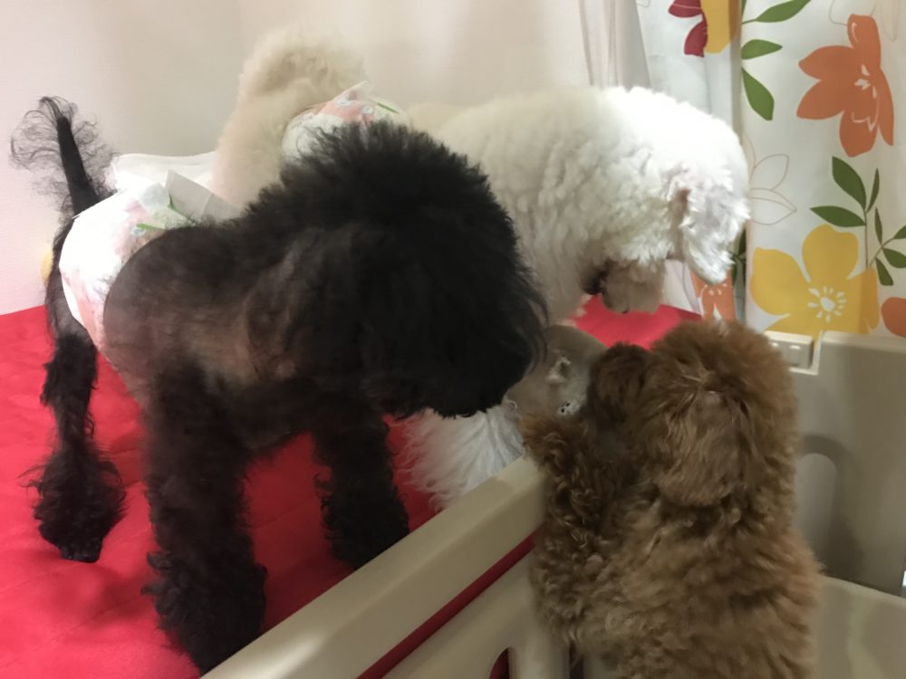 上がりたいタイム君に、まだだめだよーって2わんが言ってるみたいです🐾