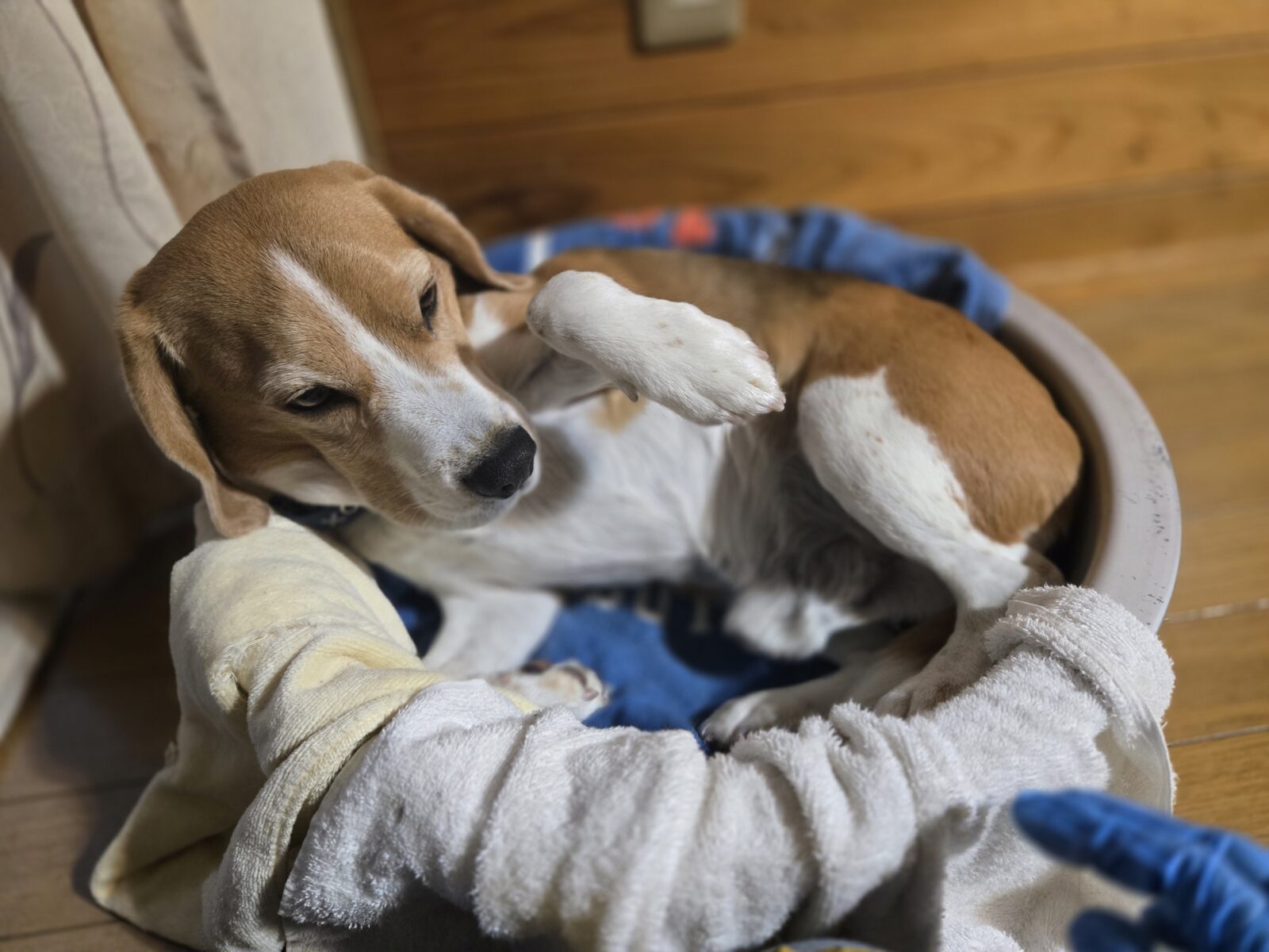 食後はボールで遊んだりして疲れたのか、お気に入りのベットでウトウト…私がじっと見ているとお腹を見せてくれました💕