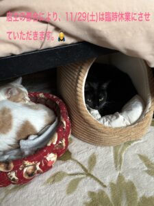 キジ猫ソワちゃん、三毛猫アメちゃんのお世話に行って来ました。普段は仲の悪い2匹ですがご飯時は向かい合わせで。
