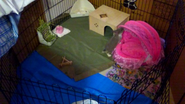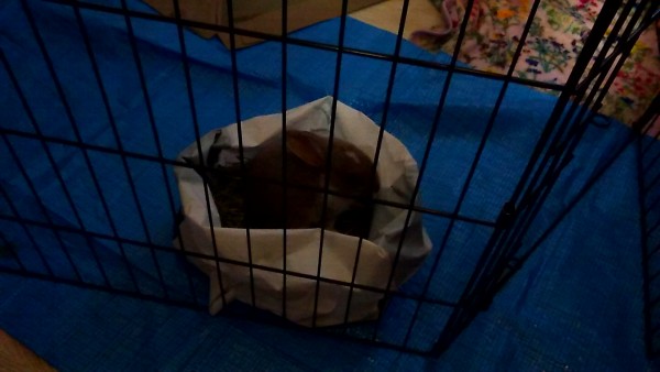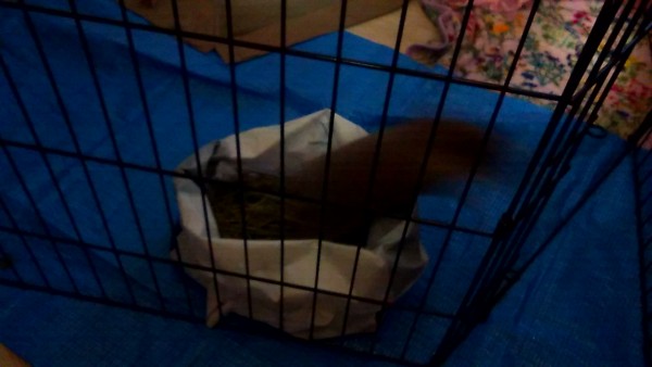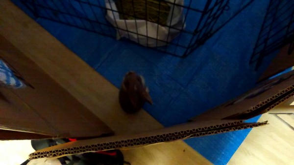 ケージとダンボールの隙間を調べたりと、出口を探しているのかな?