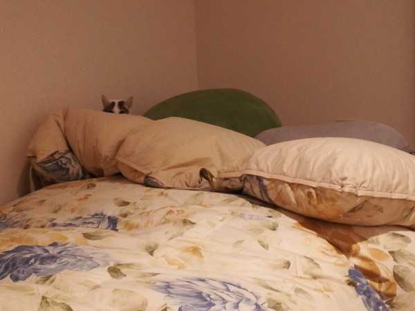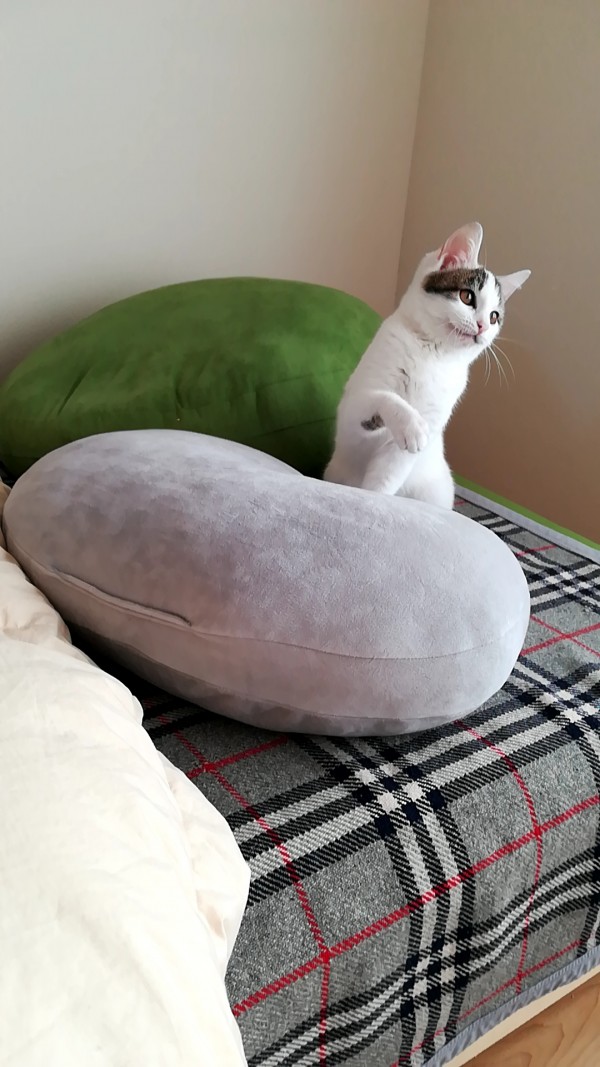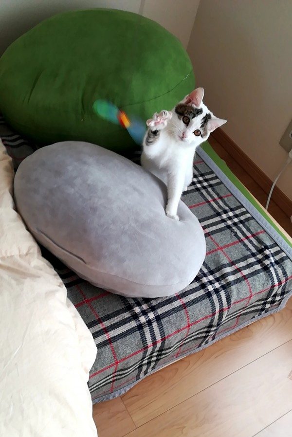 ベッドの上でじっとこちらを見ているシロちゃんの