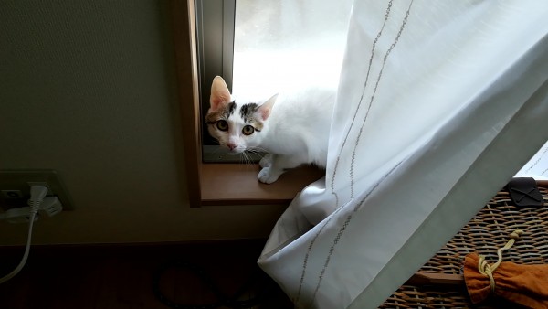 以前いた部屋のカーテン裏で温まっていました。