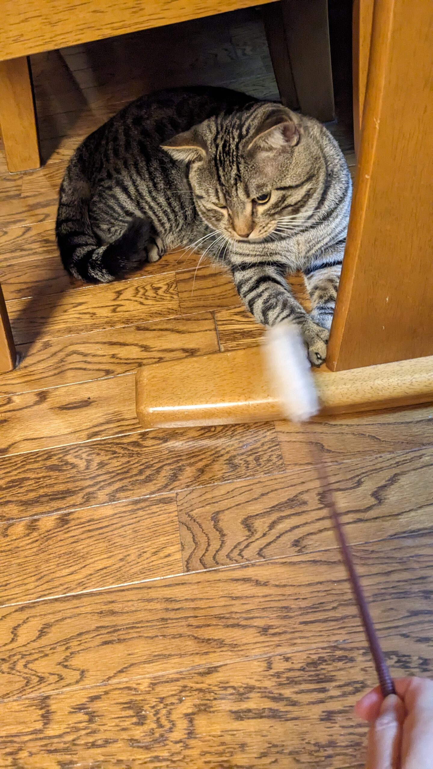 お世話の2日目には、ソファーから出て猫じゃらで遊んでくれました。