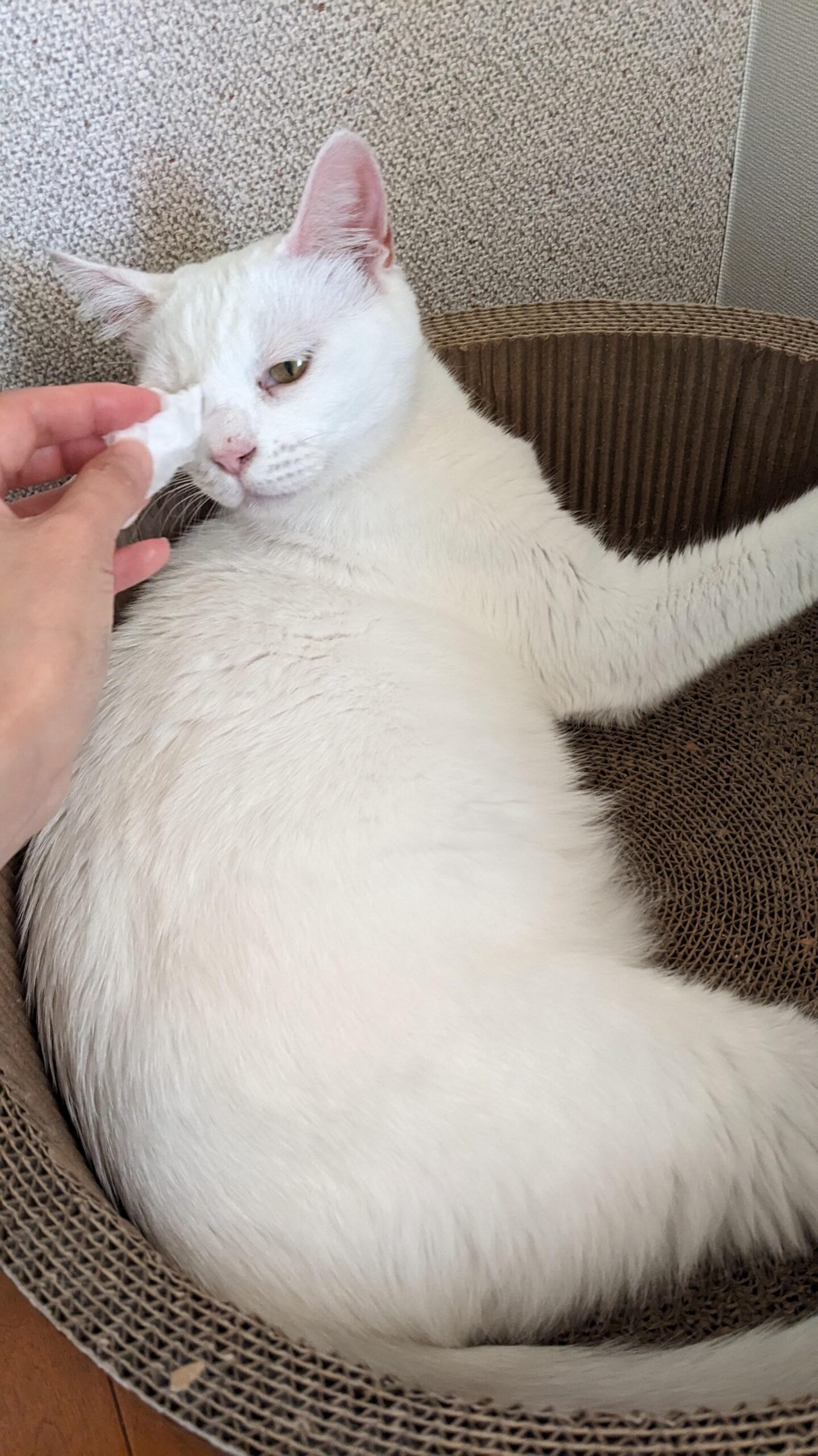 はもちゃんは、目やにが出てしまうのでコットンで拭き取ります。