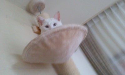 私をみるやいなや、猛ダッシュでキャットタワーによじのぼり、こちらを観察しています。