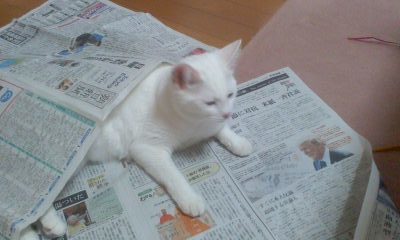 新聞をしいたらのってきました。ふんわりかぶせたら目を細めてまったり。もーたまらん。