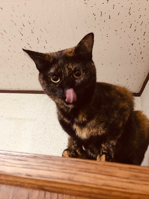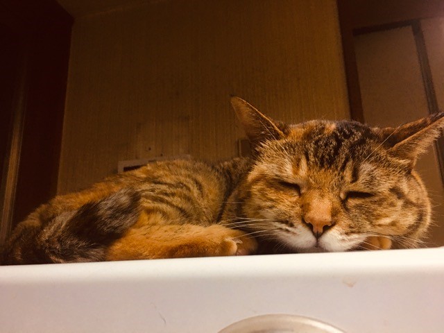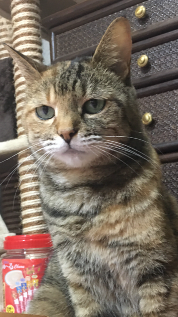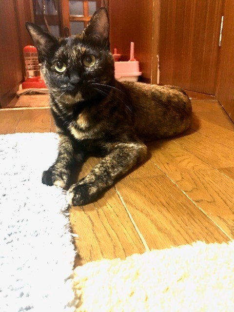 約10年前、ご家族が雨の中、病気でほとんど目のあかない状態の子猫だったあいちゃんを道路で発見し、連れて帰ってきたそうです。それからは献身的なケアで元気に復活。ご家族の職場にも一緒に出勤して人気の看板猫さんをしていたそうです。