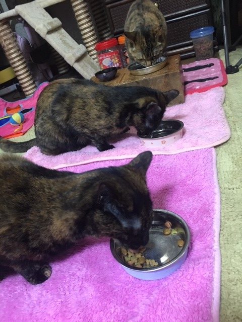 それぞれ専用のお皿で定位置で食べる3人娘。おりこうさんですねえ✨