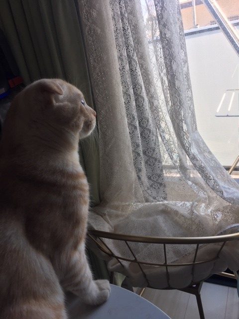 晴天の窓辺のひととき。鳥の鳴き声や外の匂いに敏感に反応しています。