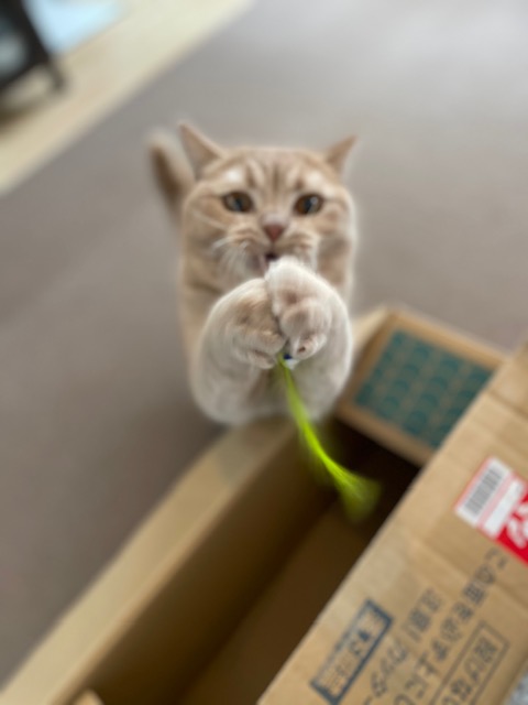 おもちゃを見つけてヒゲがぐっと前に向いています。