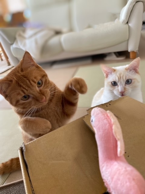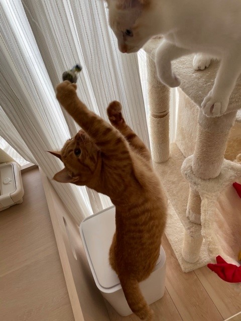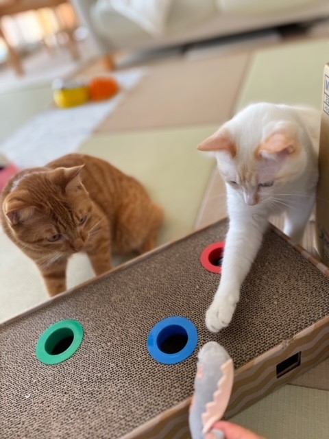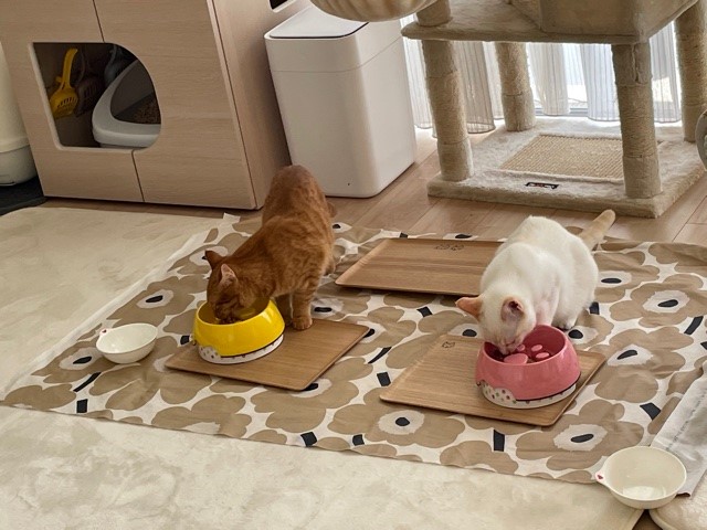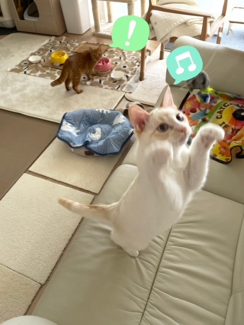 なのでお互いのごはんを食べないように先に食べ終わった猫さんをこっそりシッターがおもちゃで誘惑して気をそらしながら見張っています。