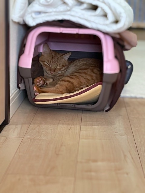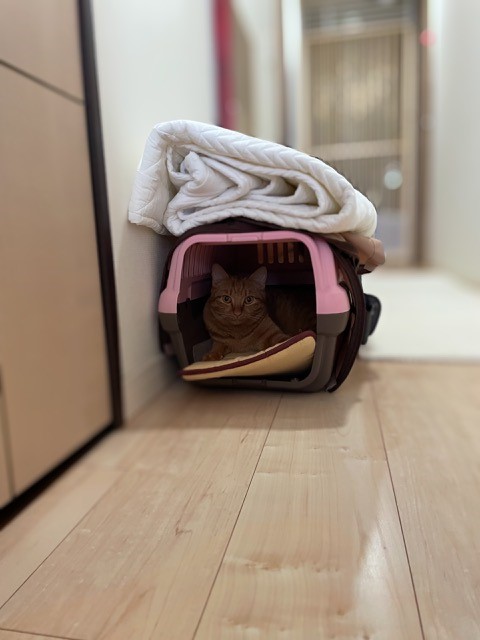 こちらは猫さんの通り道の廊下にキャリーケースが置いてあり、通院時に使用兼、普段のくつろぎスペースにもなっています。