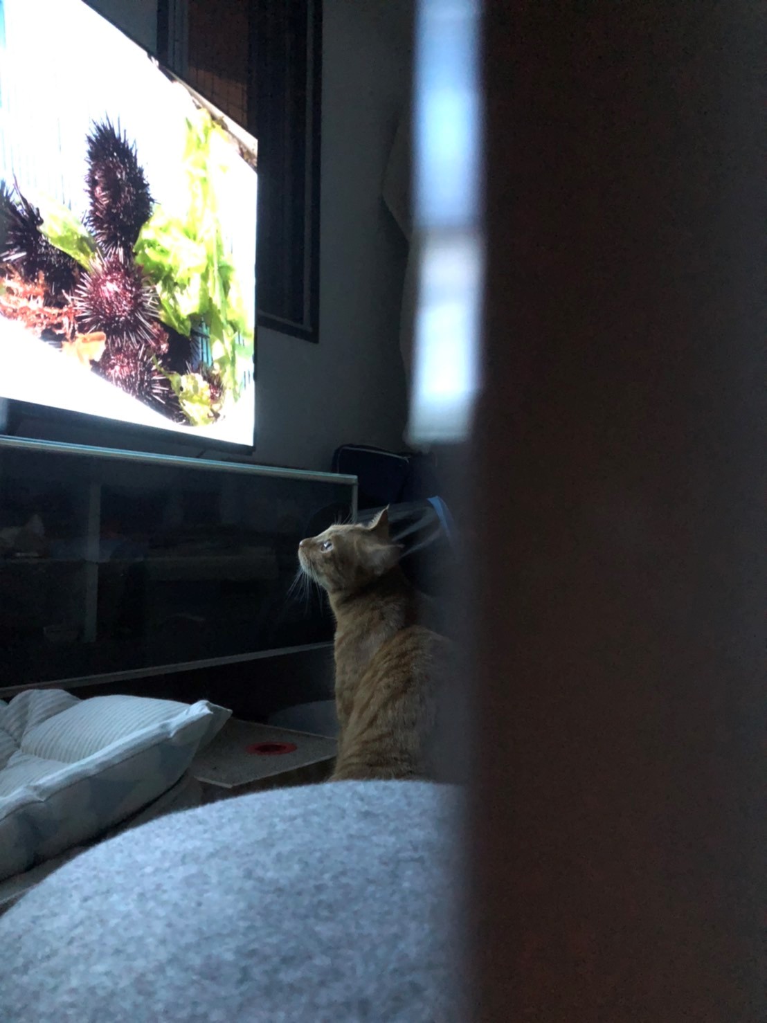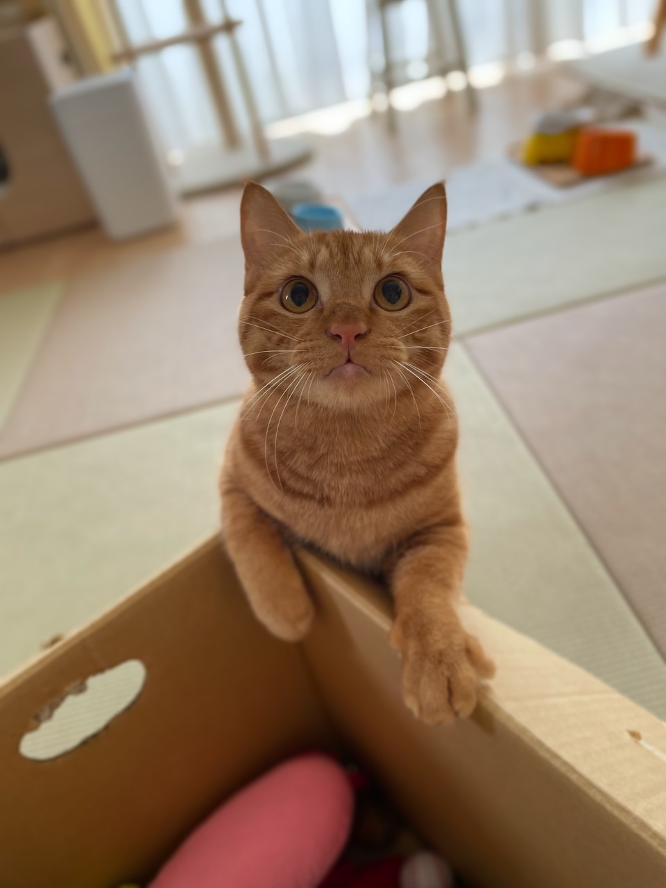 まだごはんを食べている茶トラのみらい君は困惑しています。