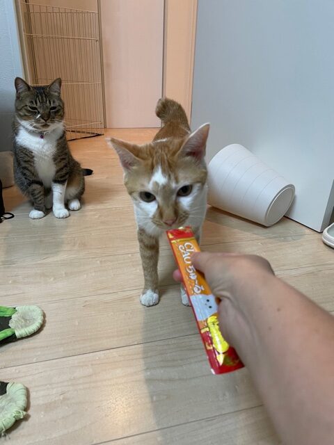ライム君が見守る中、お世話2日目はプリン君もちゅーるタイムを楽しんでくれました。