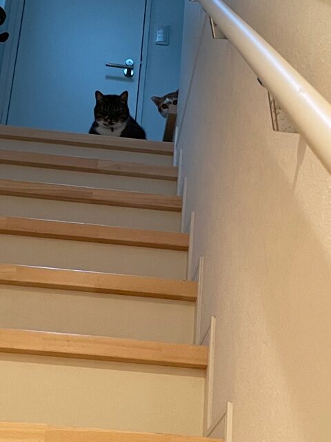 入室すると階段の上からかわいいふたりのシルエットが見えました。