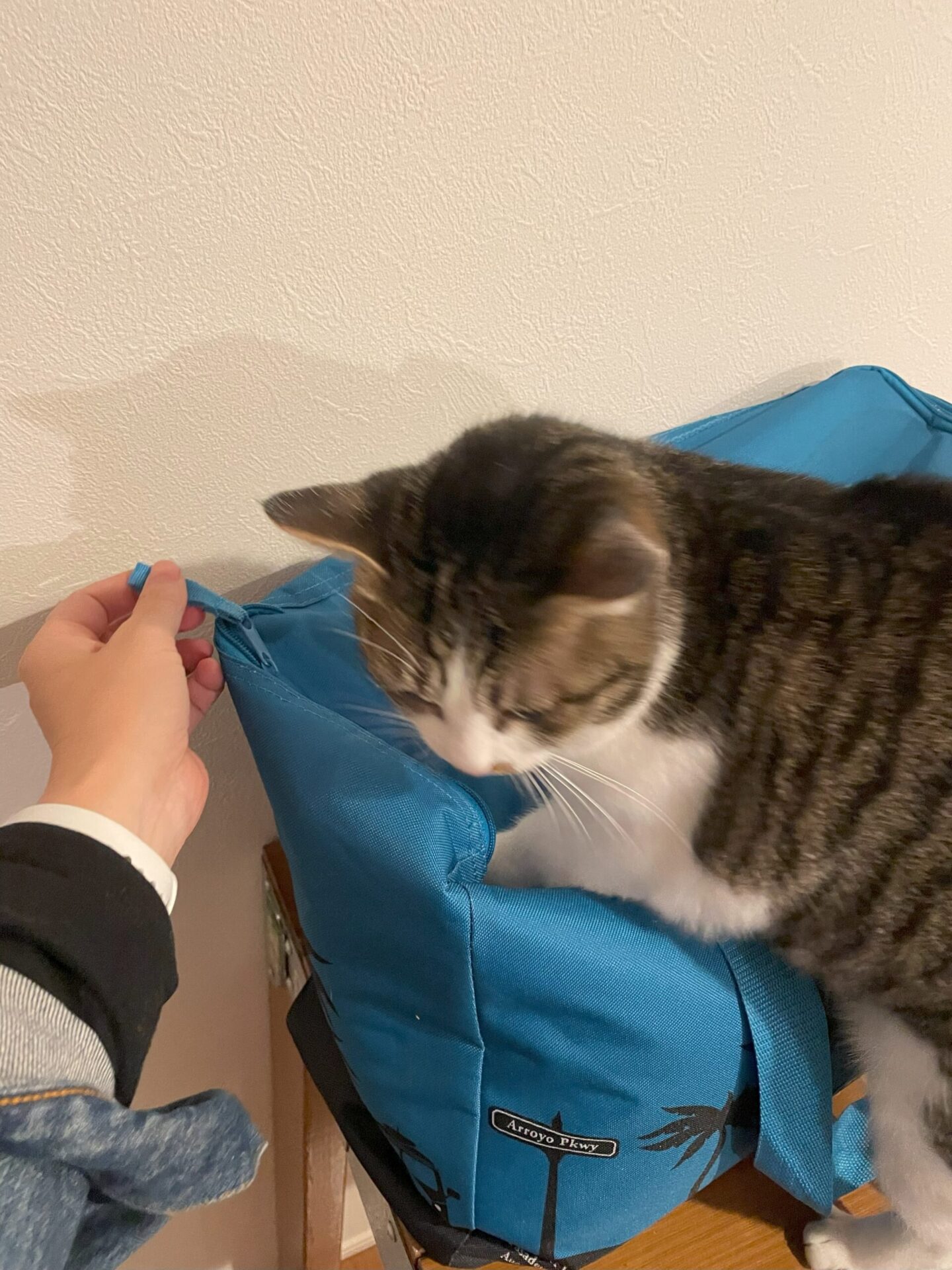 ごはんやおやつが入っているブルーのバックにダイブするふぐちゃん。