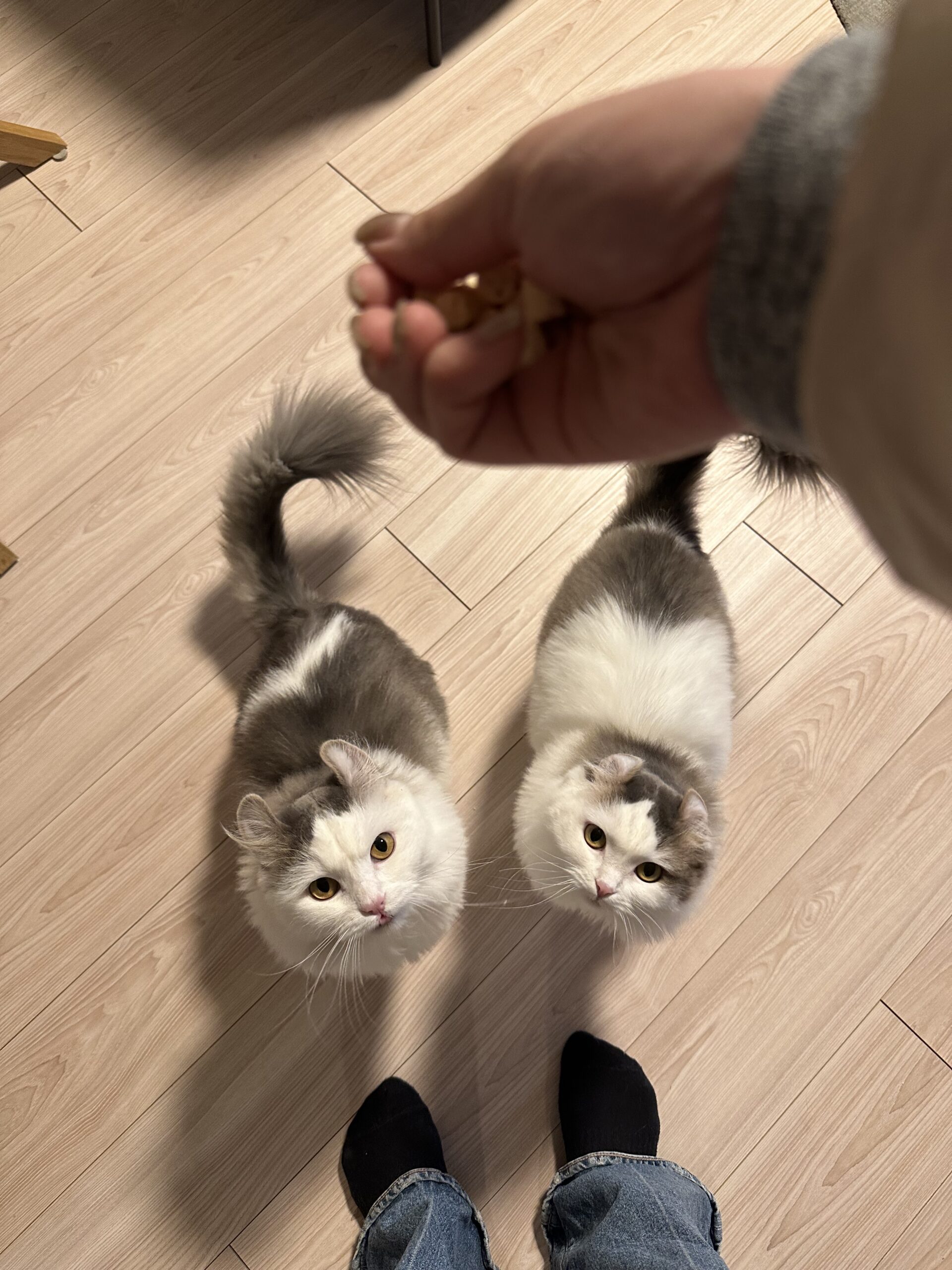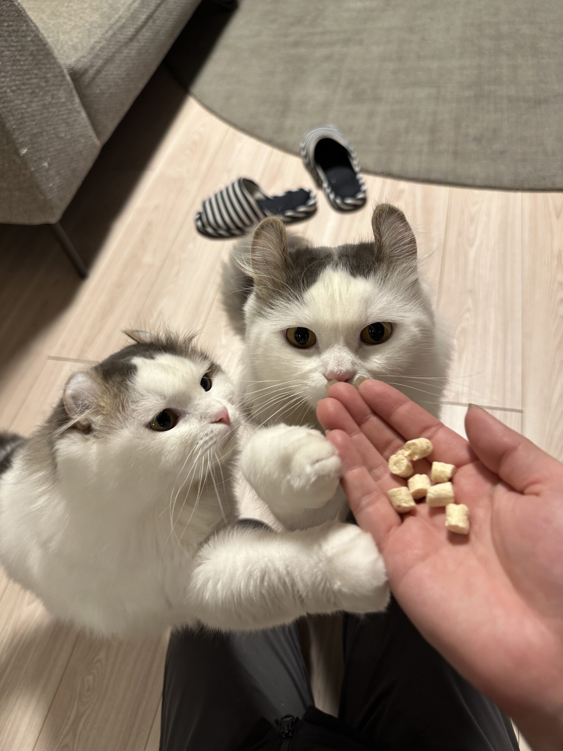 おやつの時間では2匹ともお利口さんにスタンバイし、仲良く食べておりました。とっても可愛いです🐈🐈