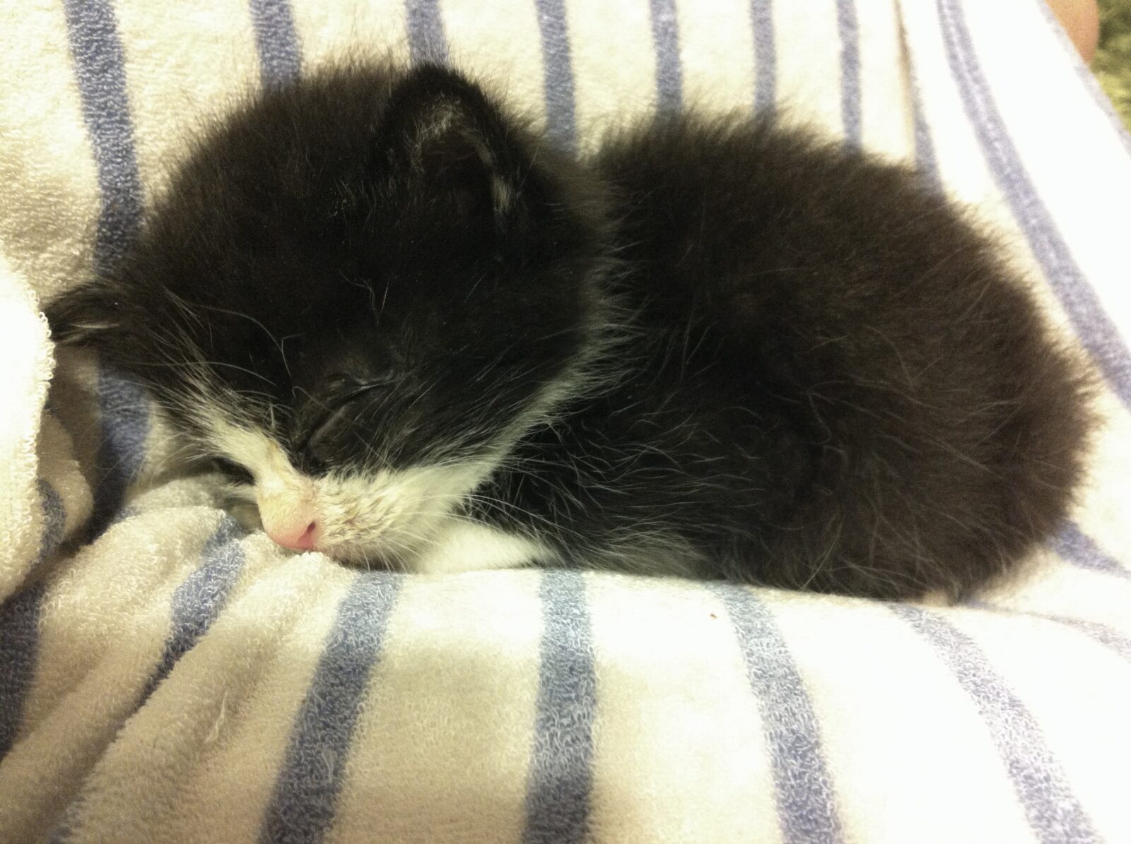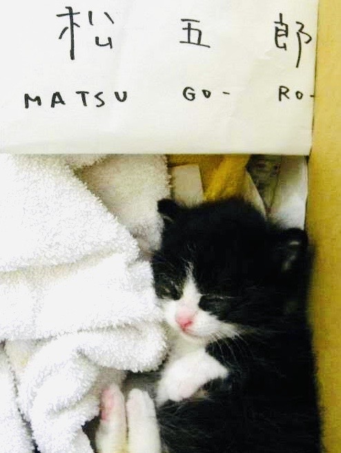 エンちゃんは、京都大学の学生さんが保護された猫でした。保護された方のお友達がセキ音楽教室(コントラバス教室)に来られている方で、ご縁を頂き、我が家にやってくることとなりました。松五郎(まつごろう)というのは、保護された方がつけてくれていたお名前。弱々しい子猫が、立派な男に育つように!という思いだったそうです。
