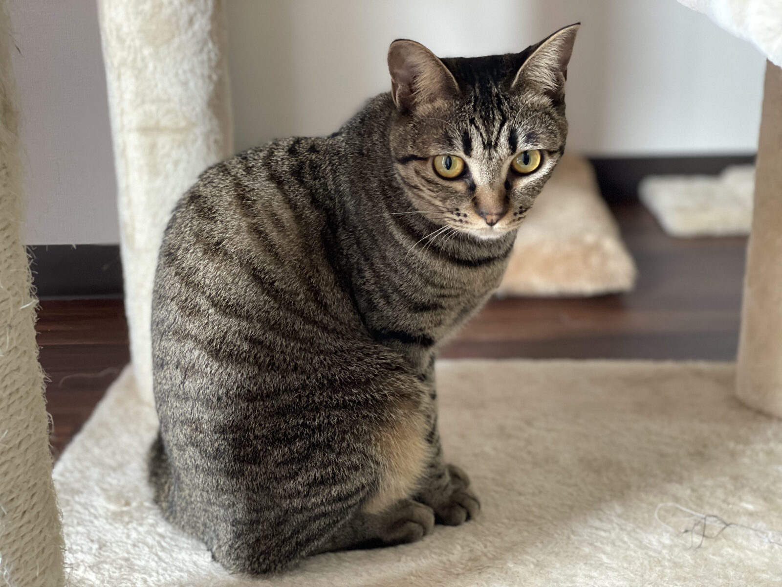 サビ猫ちゃんとキジトラちゃん!お二人とも、まだ2歳になっていないお若い猫ちゃんです。キャットタワーのてっぺんがお気に入りのご様子ですね。ちょこんと座ってかわいいですね!絵になるなぁ〜