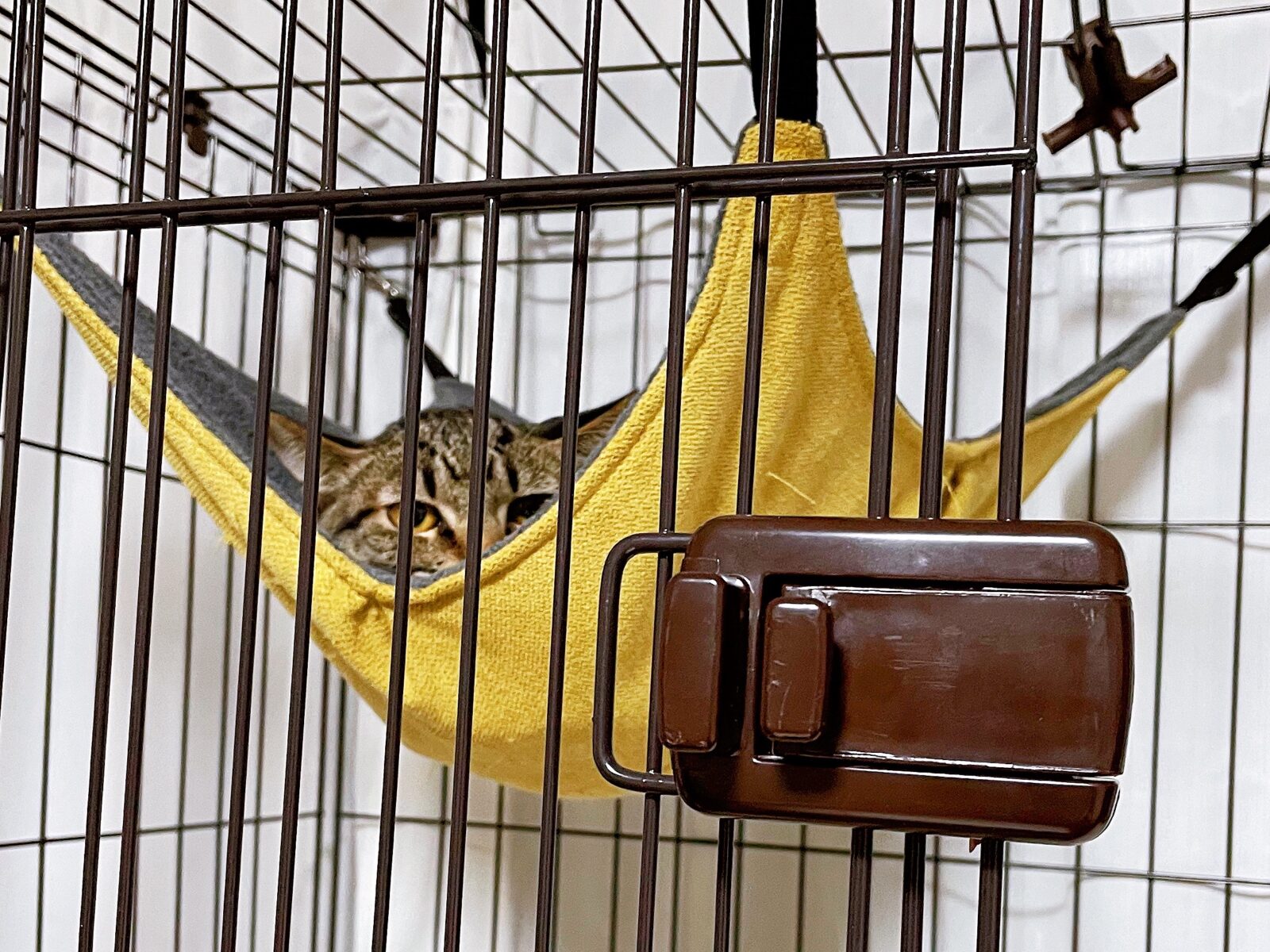 初回訪問(打合せ)時のサバトラ君。ハンモックの上で超緊張され、ボクに気が付かないでね…というご様子でした。お預かり中の猫ちゃんで、まだ人馴れされていらっしゃらないそうですが、優しいお客様のもと、きっと心を開かれることと思います。
