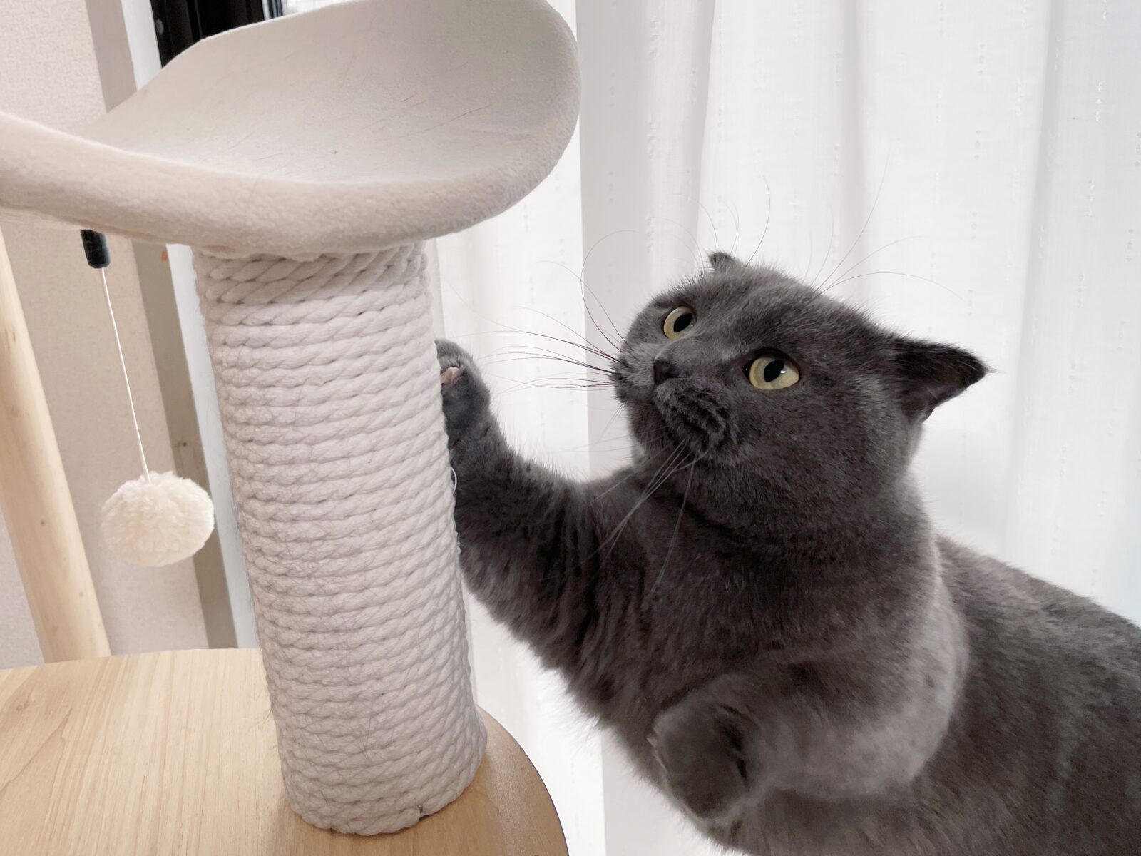 猫じゃらしのおもちゃをねらっているマンチカンちゃん♡真剣なまなざしです!