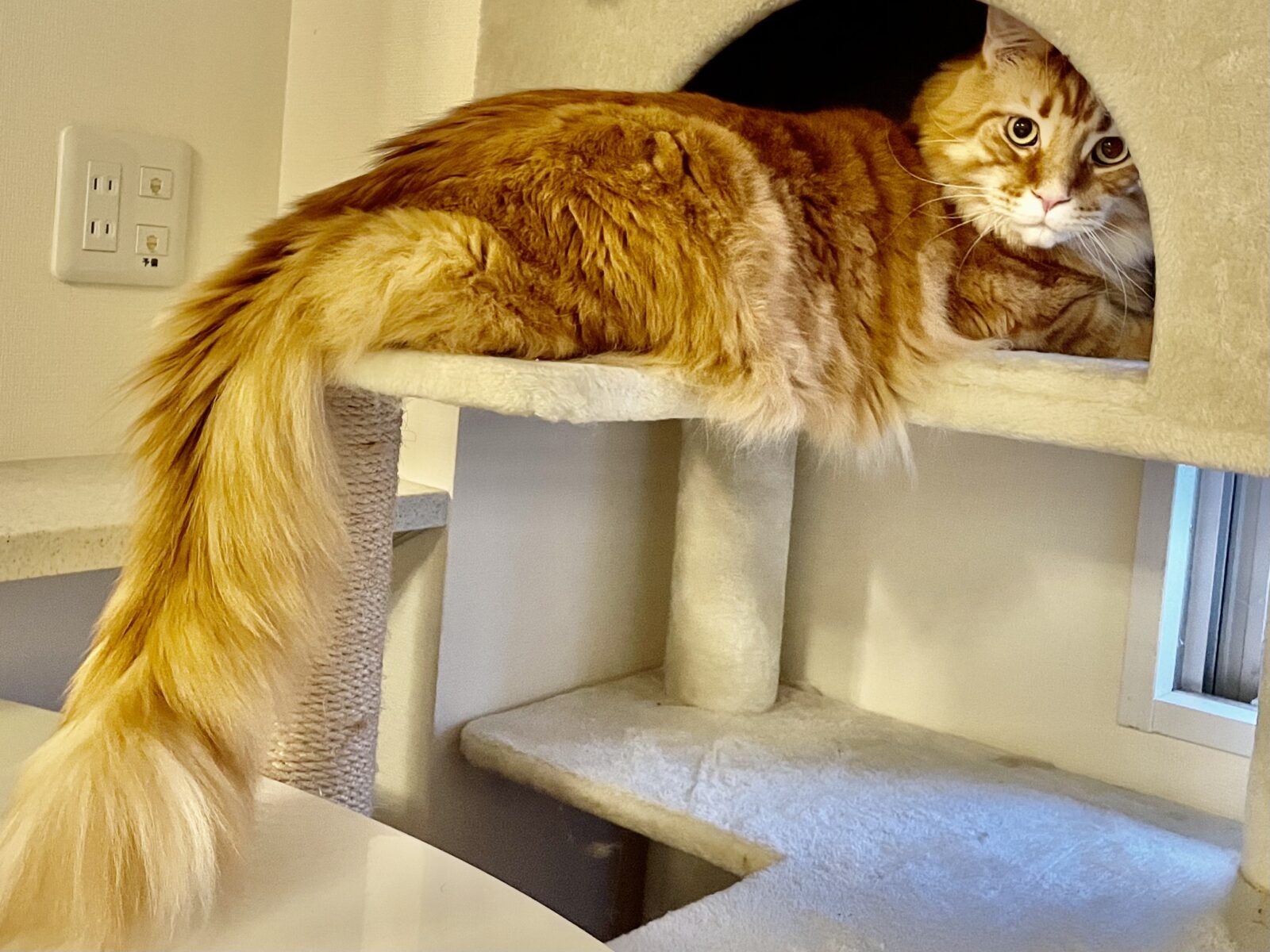 レッドタビーのメインクーン君♪ しっかりとしたボディに、歩くたびにふわふわ〜となびくお尻尾が魅力的なのです。