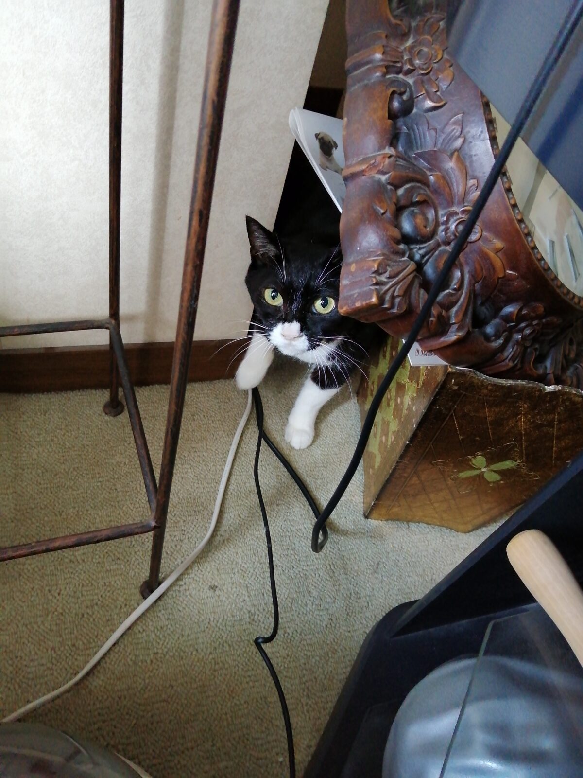 ちょっぴり人見知りなパンダ柄ニャンちゃんは距離を置いてすみっこから顔をだしてくれました(笑)