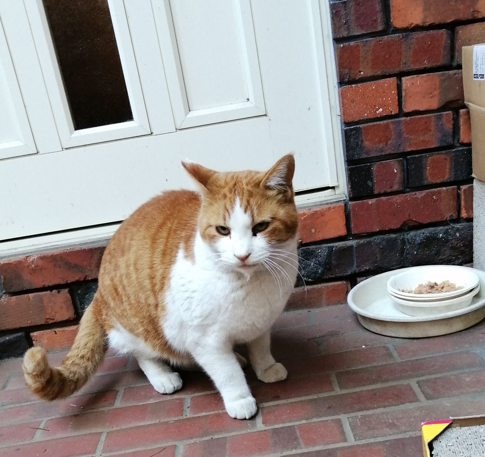 もう一匹の2才の茶白くん(地域猫)は、お客様宅のお庭に住んでいて時折、テラス越しにおじいちゃまニャンコくんとお話をしていました(笑)