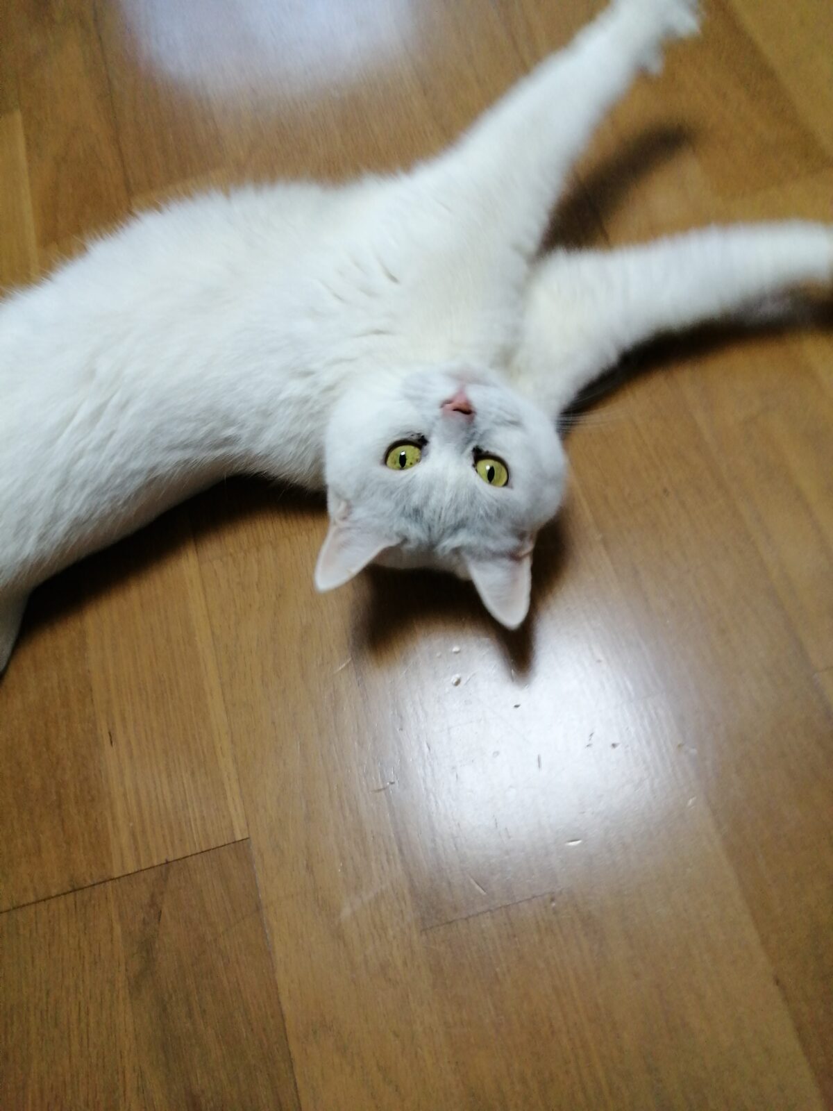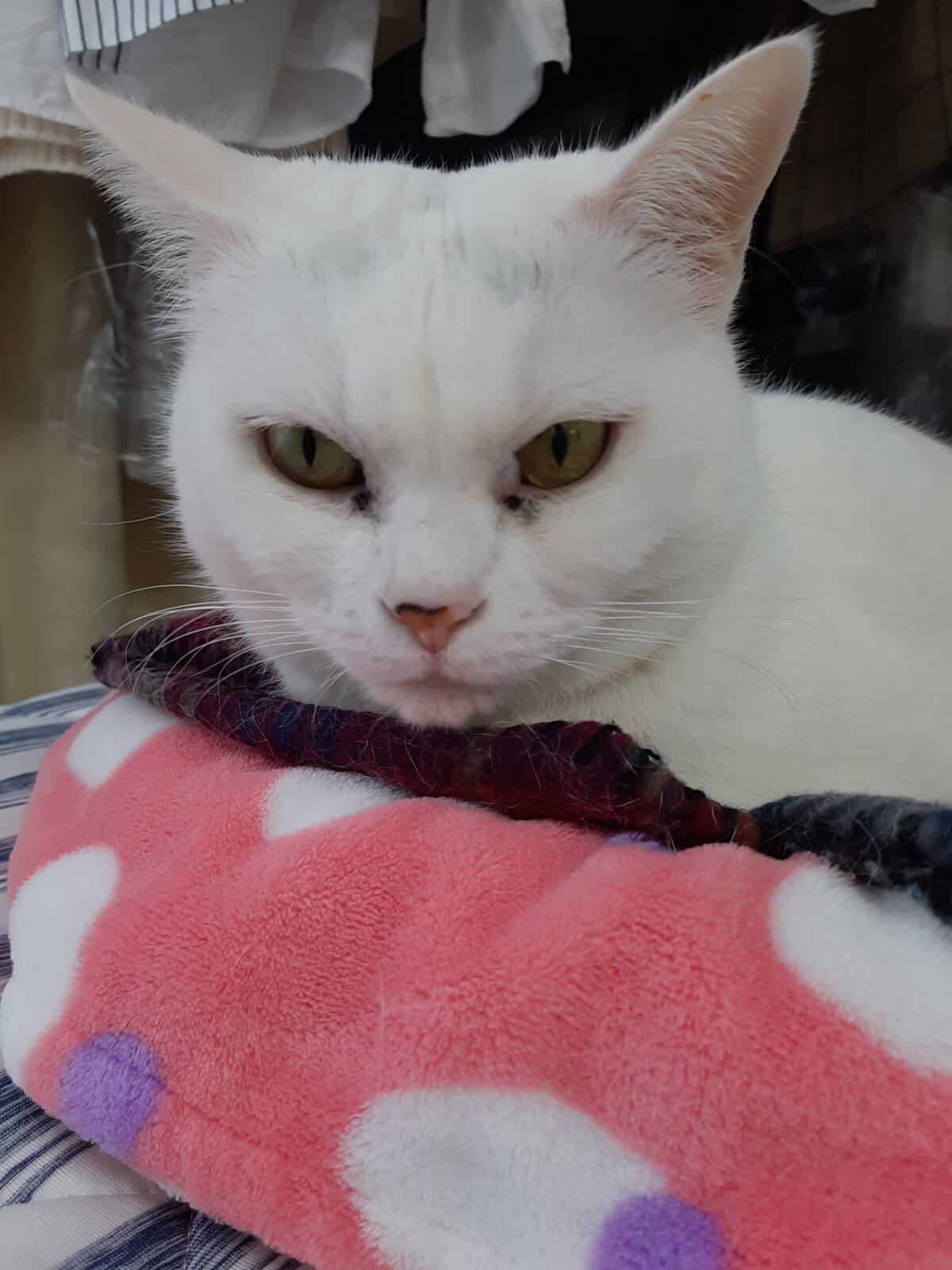 真っ白な雪色の毛並みがとても綺麗で高齢猫ちゃんには見えません。