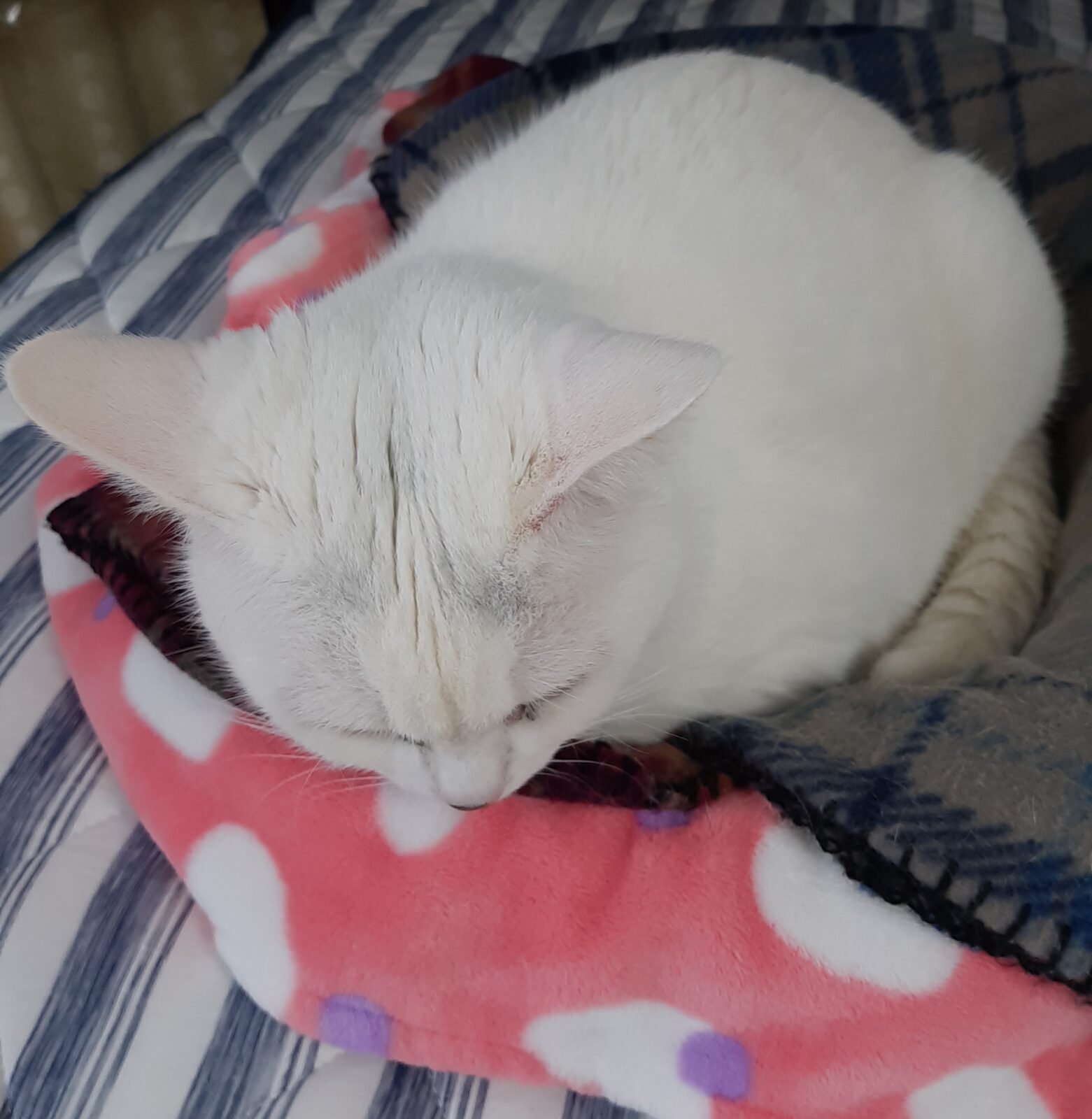 ご飯もシッカリ食べて元気一杯です。食後はベッドに入り大きなアクビ(笑)をして気持ち良さそ〜うにす〜やすや〜と寝てしまいました。