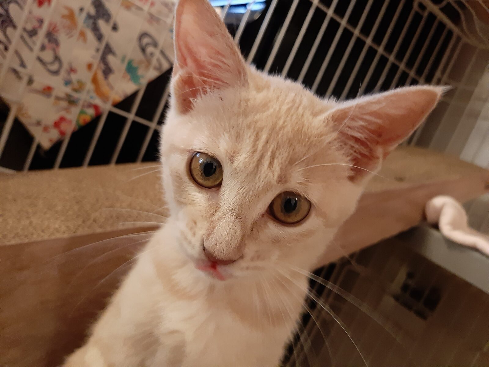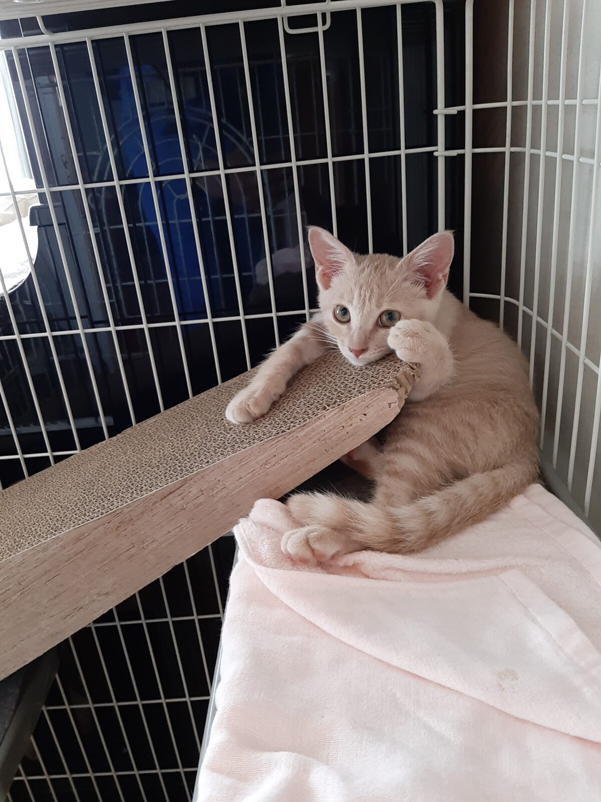 子猫ちゃんはトライアル期間でケージの中で訓練中です。