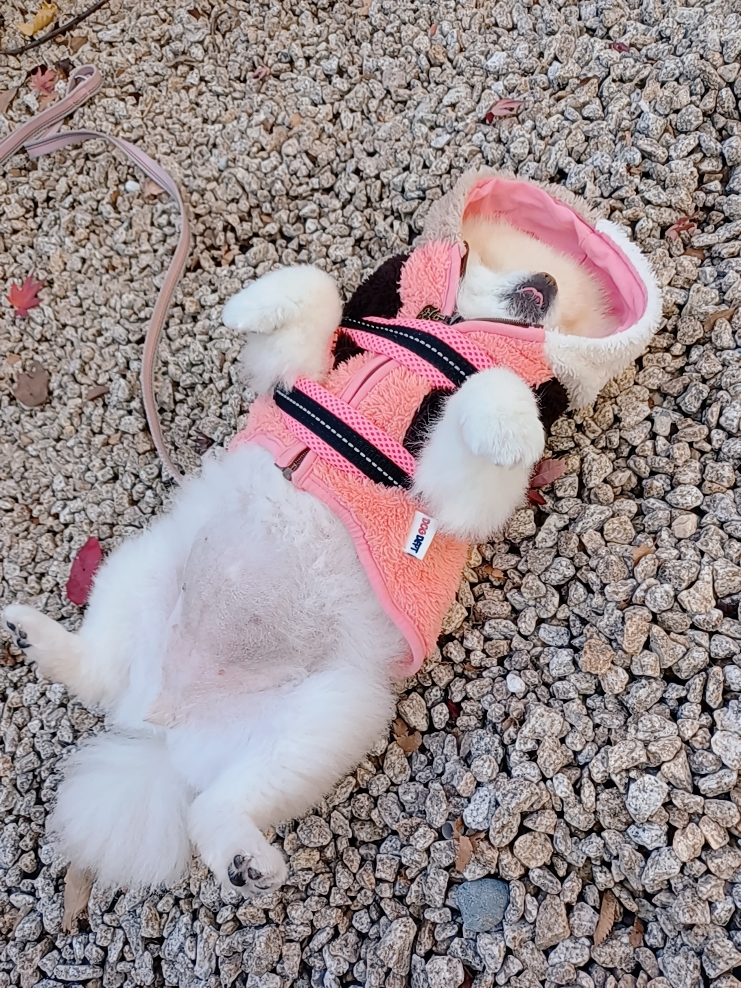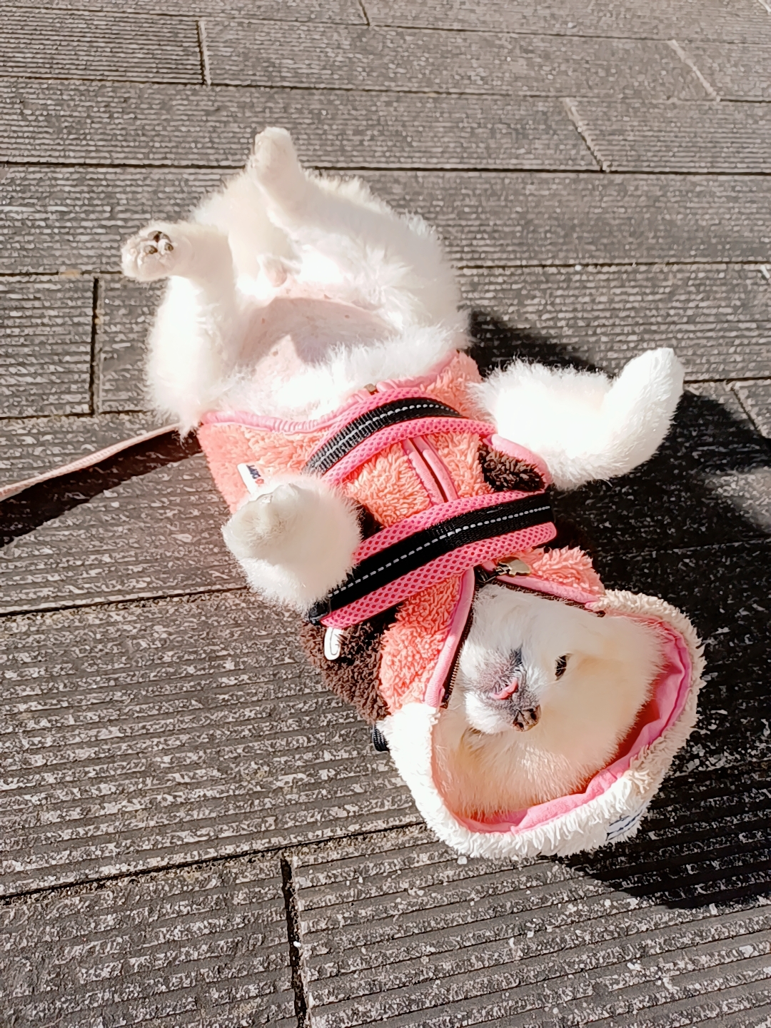 お散歩に出掛けて休憩するとゴロンと転がりお腹を見せて触ってちょうだいアピール🐶
