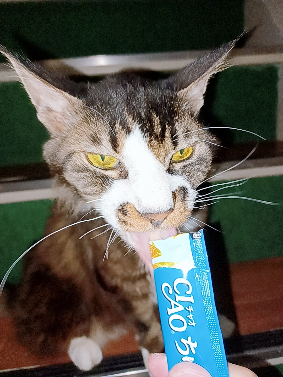 ご飯が大好き、ちゅーるは大好物😸気持ちいい食べっぷりです。
