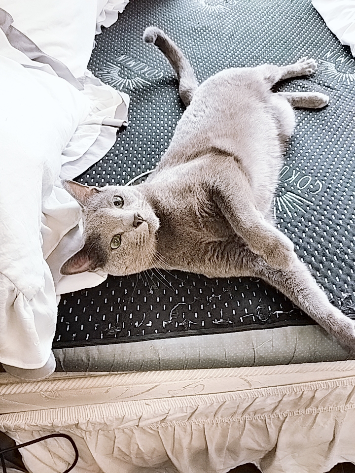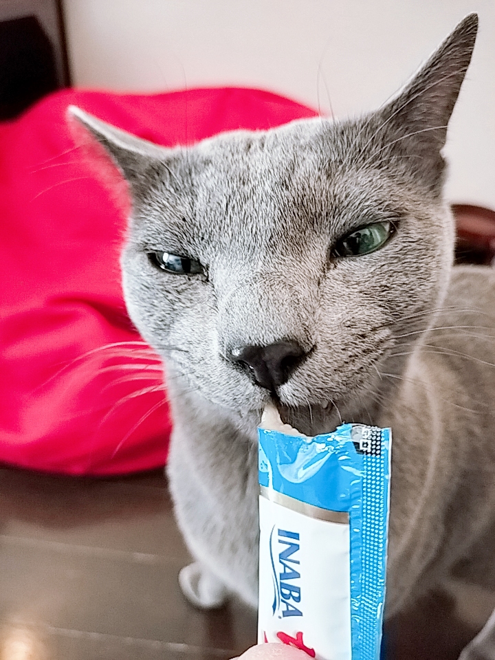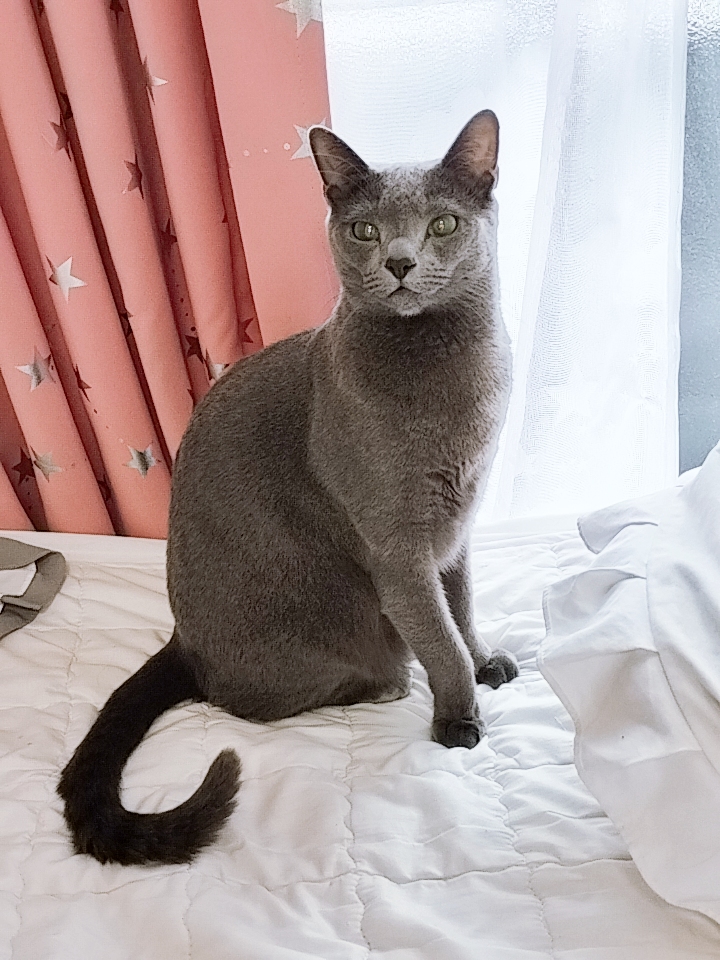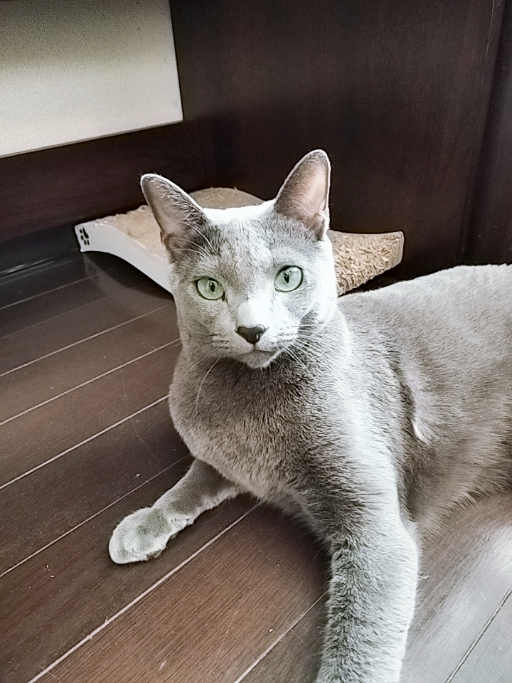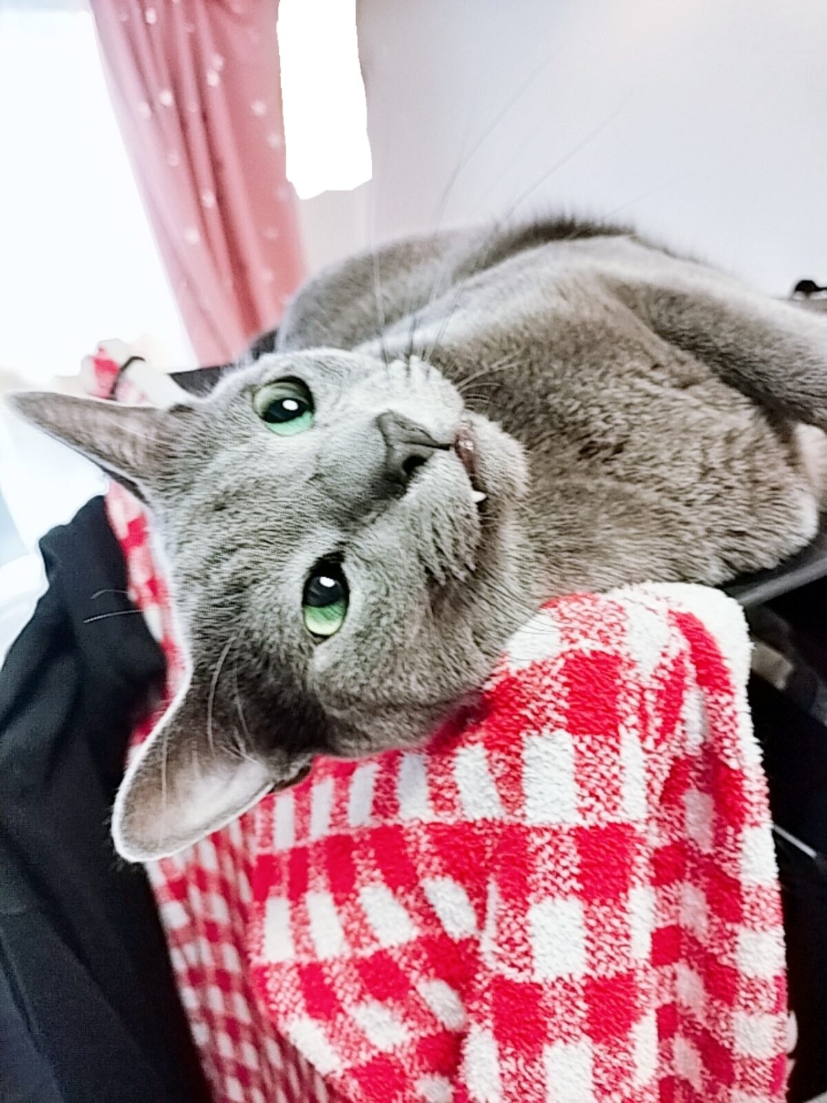 嬉しくなると身体を大きく捻ってくねくねスリスリ大好きなロシアンブルーくんでした〜😺