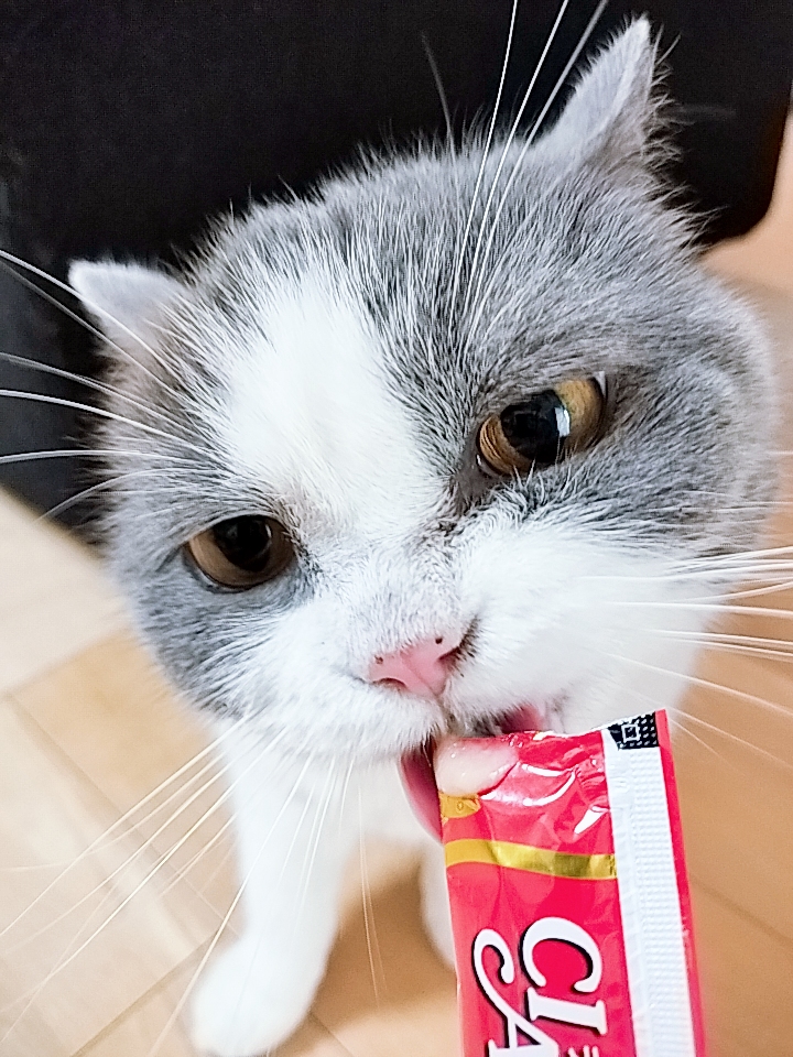 先ずは、お顔とお耳拭きをしてお利口にしていてくれた ご褒美に大好きなちゅーるをど〜ぞ!?