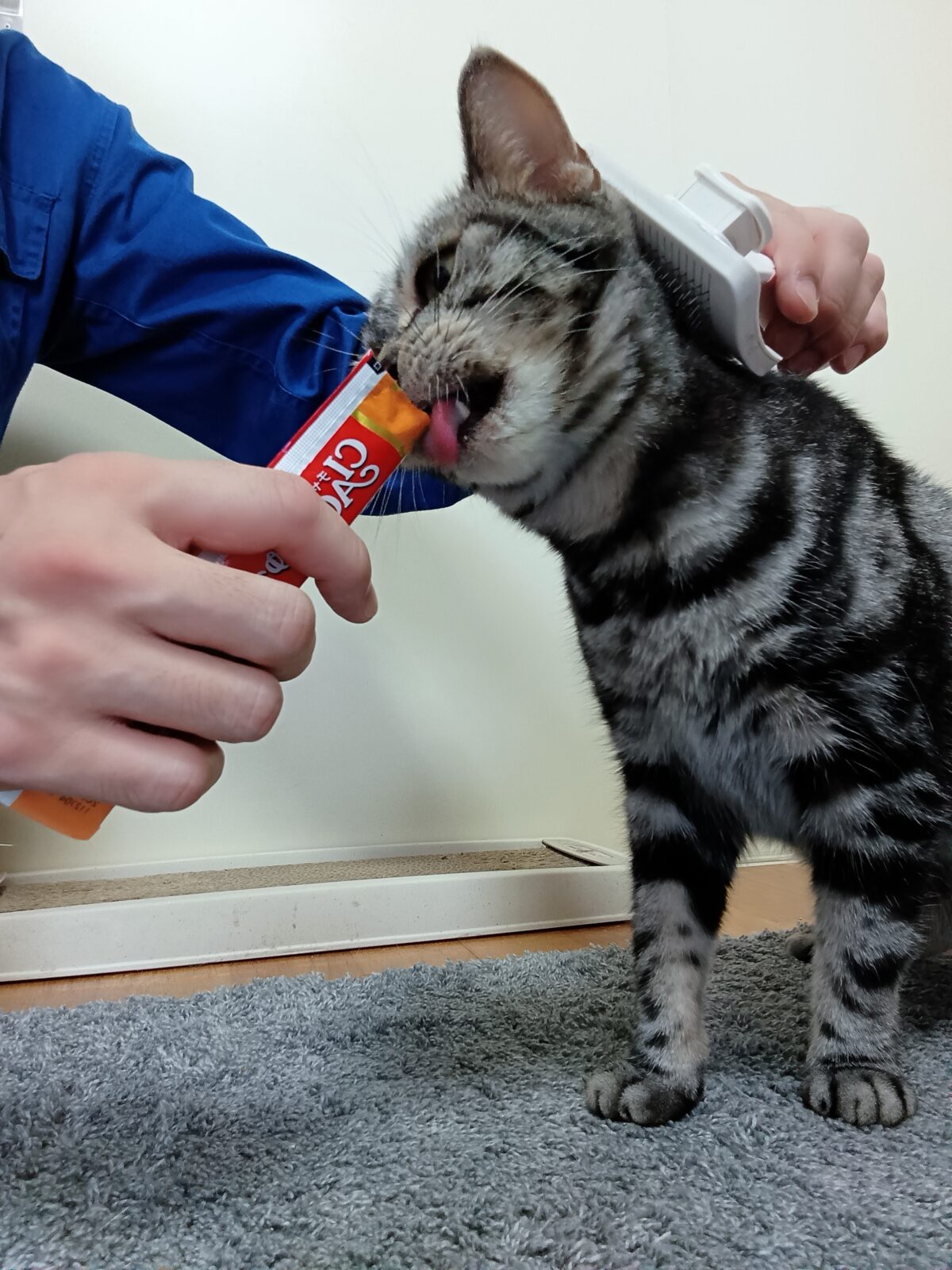 ちゅーるを食べながらのブラッシングはとっても大人しくさせてくれるんですよ〜😸