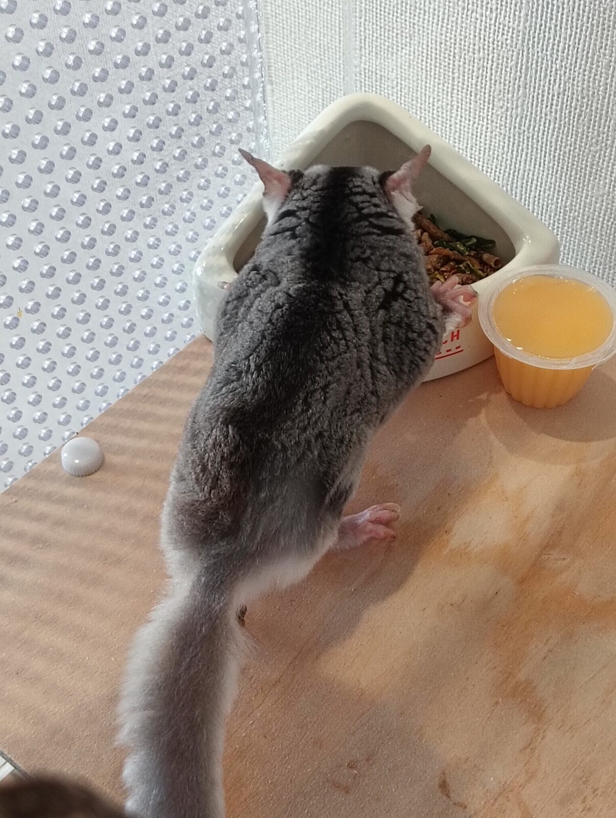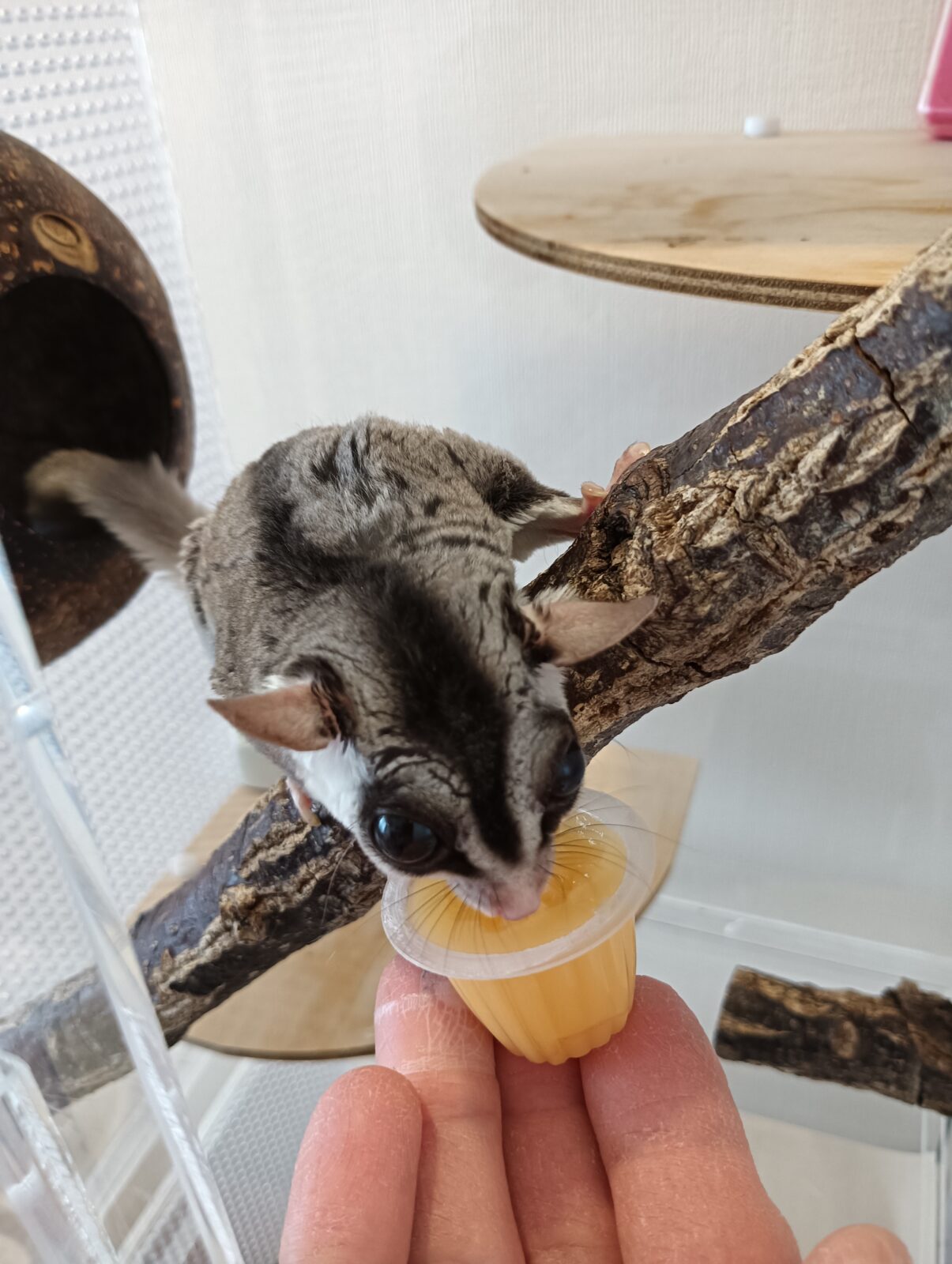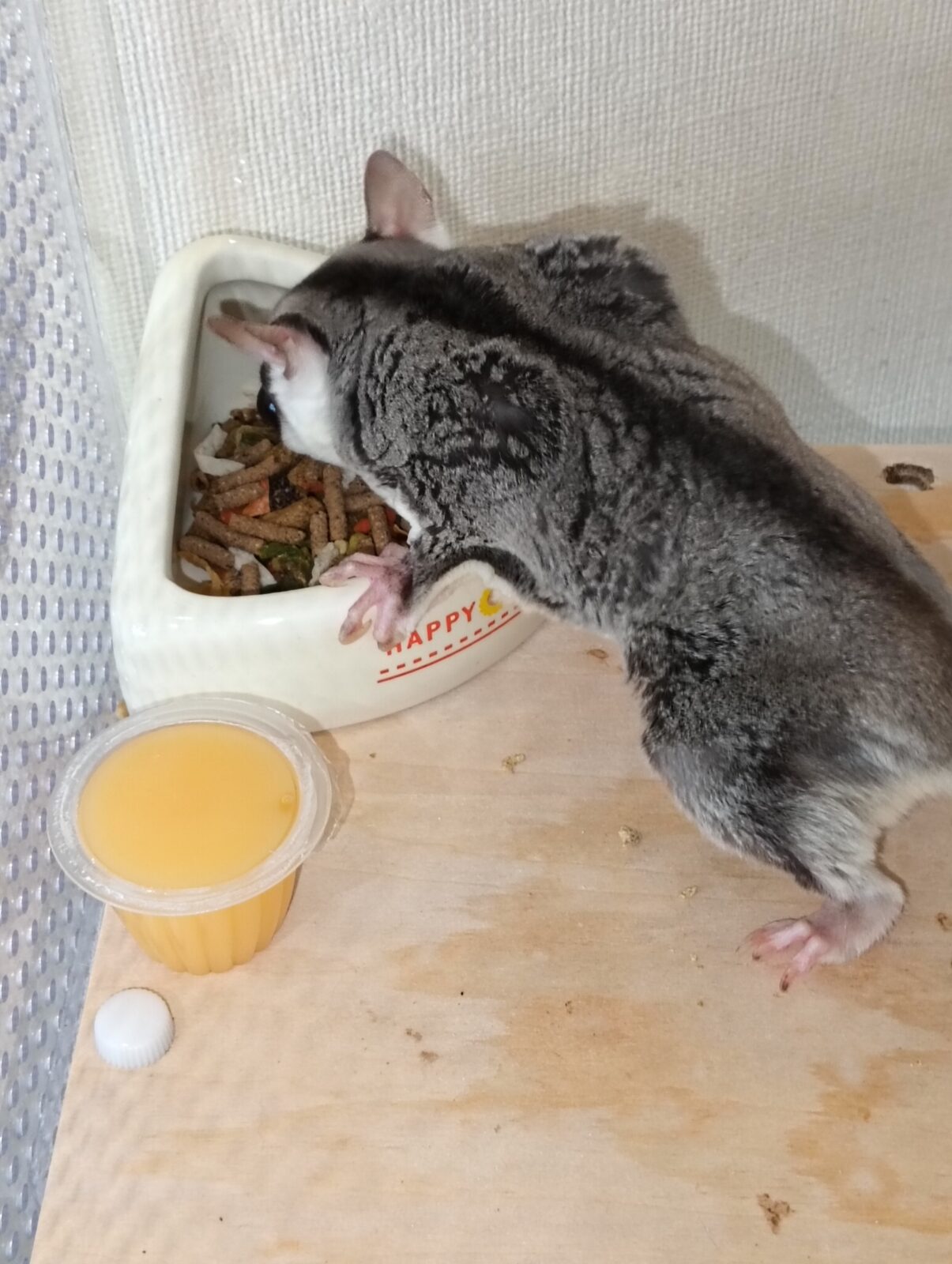 お部屋でお休み中のフクロモモンガくんに大好物のゼリーを見せたら直ぐさま食べ始めました🦉