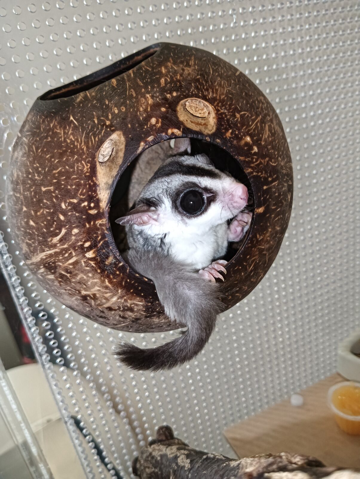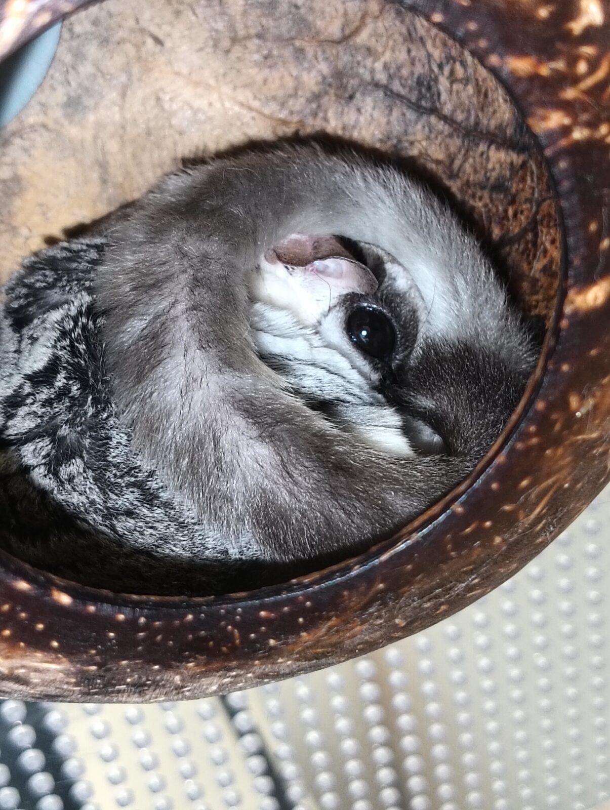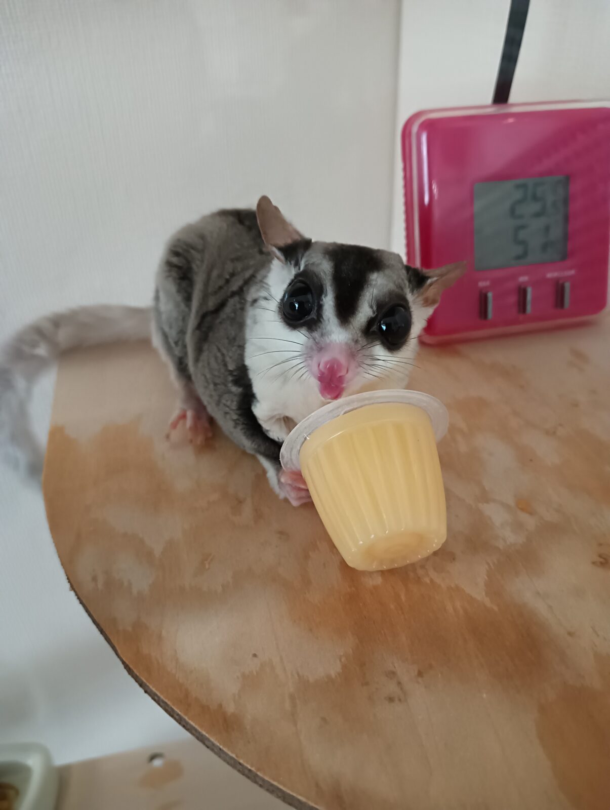 お部屋でお休み中のフクロモモンガくんに大好物のゼリーを見せたら直ぐさま食べ始めました🦉